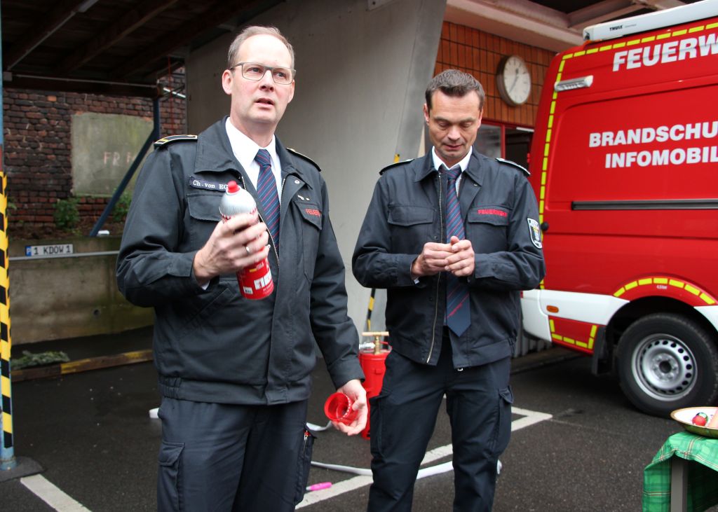 „Gut funktioniert eine Gießkanne“, erklärte Markus Wehr. „Die sollte allerdings schon mit Wasser gefüllt sein.“ Was platzsparend, effektiv und sicher ist, sind Löschsprays. „Die sind zwar nicht so preisgünstig“, sagte Christian von Egen, „aber für die üblichen Brände im Haushalt geeignet.“ Ein beginnendes Feuer kann aus 2 bis 3 Metern Entfernung schnell gelöscht werden, ohne dass man sich dabei in Gefahr bringt. Außerdem sind diese Löschsprays sehr einfach zu handhaben. Sie funktionieren wie beispielsweise ein Haarspray.