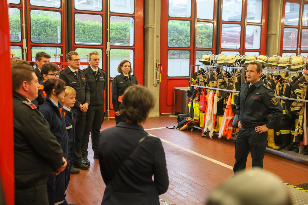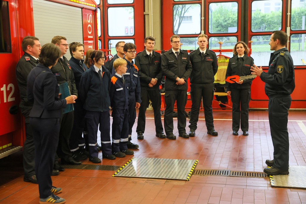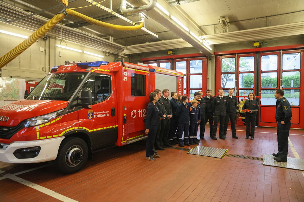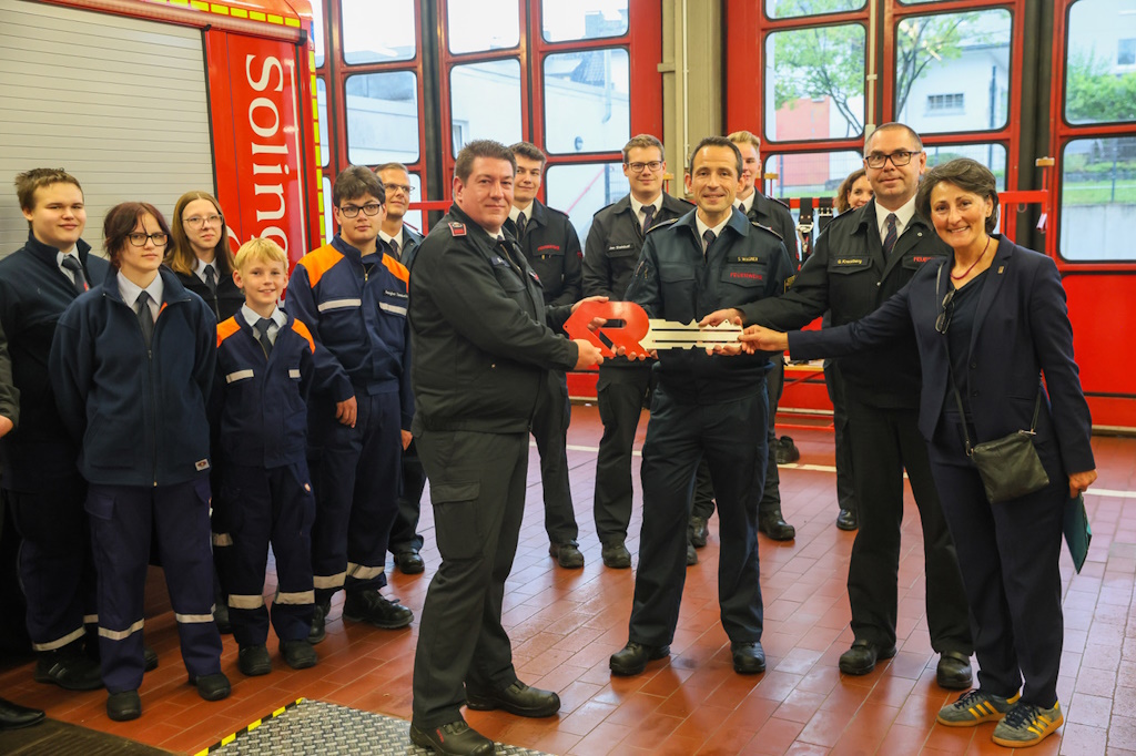 SOLINGEN (red) – Am Dienstag haben auf der Feuer- und Rettungswache I an der Katternberger Straße Sebastian Wagner (Leiter Feuerwehr Solingen) und Gottfried Kreuzberg (Abteilung Technik) gemeinsam mit Bürgermeisterin Ioanna Zacharaki ein nagelneues Löschfahrzeug an Solingens Stadtjugendfeuerwehrwart Bastian Georg übergeben. Mitglieder der Solinger Jugendfeuerwehr waren zur Übergabe gekommen, um sich direkt einen Eindruck ihres neuen Einsatzfahrzeuges zu verschaffen.
