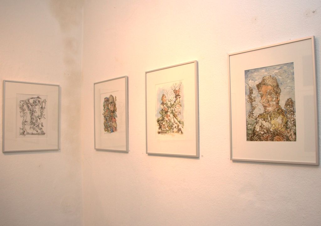 Wer die aktuelle Ausstellung in der Galerie von Ela und Emma Schneider besucht, sollte etwas mehr Zeit mitbringen. Zum einen, weil sie zusätzlich zu den Ausstellungsräumen noch einen Raum im ersten Stock einnimmt, und zum anderen, weil die Bilder dazu einladen, genauer hinzuschauen. Unter dem Titel „Phantastische Reise zum Mittelpunkt der Menschlichkeit“ sind hier überwiegend Federzeichnungen, aber auch einige Aquarelle von Jan Boomers (frühere Ausstellung) zu sehen, die von enormem Detailreichtum und einer ungeheuren Tiefe bestimmt sind.