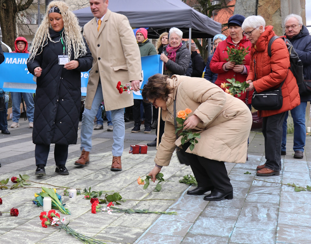Am Freitagnachmittag startete eine Mahnwache auf dem Walter-Scheel-Platz im Gedenken an die Opfer des russischen Angriffskriegs. Auch mit Blumen gedachte man der Getöteten. Agnieszka Moranska-Röder, Vorsitzende des Vereins „Helfende Schirme Solingen“, legt eine Rose nieder. (Foto: © Bastian Glumm)