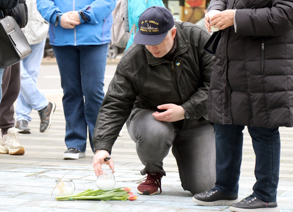 Vor dem Rathaus mitten auf dem Walter-Scheel-Platz wurde das ukrainische Staatsgebiet in blauer und gelber Kreide aufgemalt. Die Anwesenden legten auf diese „Kreide-Karte“ Blumen und gedachten der Getöteten. „Ich habe meine Blume auf die Stadt Charkiw gelegt. Viele meiner Freunde und auch Verwandte leben dort noch immer unter ständigem Bombardement. Wir dürfen das alles nicht vergessen, lasst uns weiter zusammenhalten und unseren Beitrag dazu leisten, dass der Krieg so schnell wie möglich vorbei ist“, wünschte sich Stan Krasnokutskiy vom Verein „Helfende Schirme Solingen“ und sprach damit wohl den meisten Anwesenden aus der Seele.