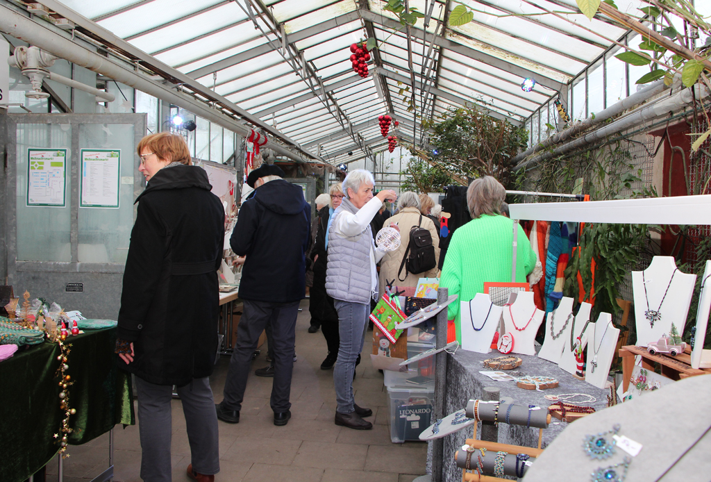 Die Vorbereitungen sind aufwändig und es wird viel Men-Power gebraucht. „Wir haben 30 bis 40 Leute, die am Auf- und Abbau beteiligt sind.“ Die komplette Orchideenhalle musste ausgeräumt werden. Doch der Aufwand hat sich gelohnt. Die Besucher genießen ganz offensichtlich diesen unkonventionellen Weihnachtsbasar. „Wir verlangen keine Standgebühr“, so Hieronimus, „sondern bitten um eine Spende.“ Und auch die Besucher werden mit der Spendenbüchse um eine Spende für Hospiz und Botanischen Garten gebeten. „Wir teilen am Schluss“, verspricht Harro Hieronimus.