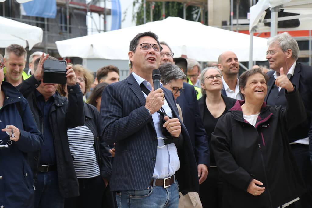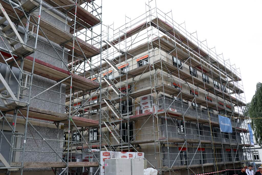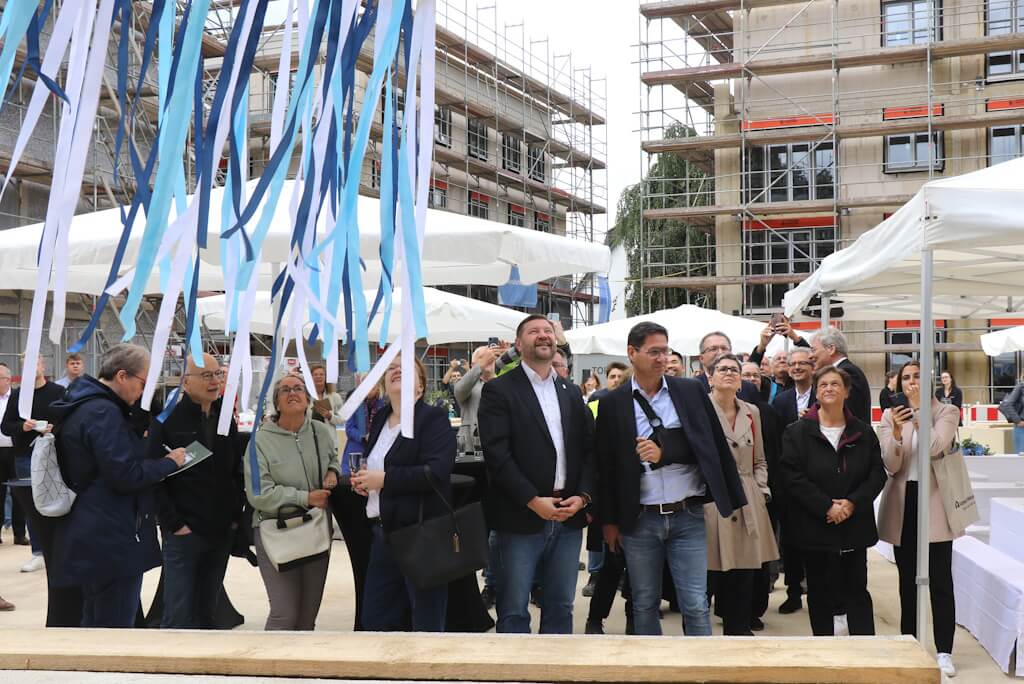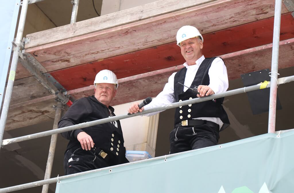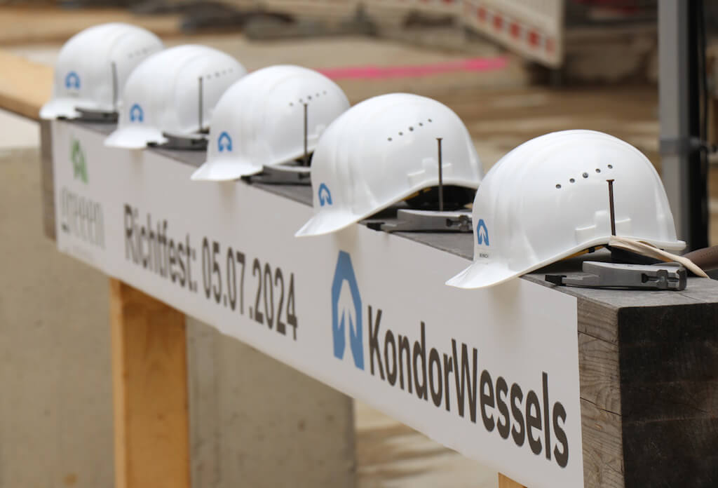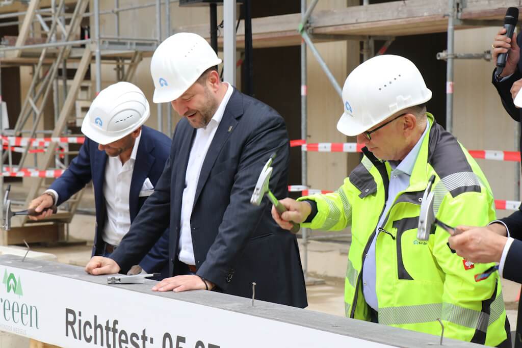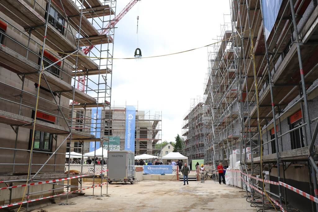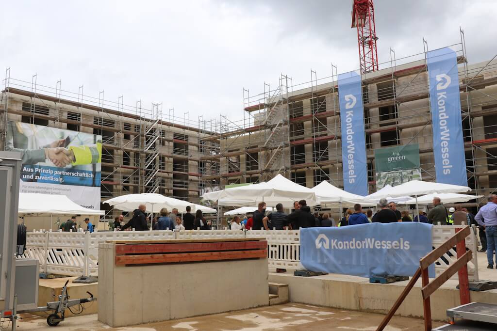 SOLINGEN (bgl) – Man kommt nicht umhin, einen Vergleich mit einer mittelalterlichen Festung zu ziehen: Hier das Eingangstor, das man von der Locher Straße aus passiert, um sich schließlich in einem großzügigen Innenhof wiederzufinden. Dort ringsum freilich keine wehrhaften Mauern, sondern im Rohbau befindliche Wohngebäude. Am Freitag ludt das Bauunternehmen Kondor Wessels nach Wald ein, um Richtfest auf der dortigen Großbaustelle zu feiern. Das ambitionierte Bauprojekt „Greeen“ umfasst insgesamt sieben Gebäude mit 167 Wohnungen, 99 davon sind als Eigentumswohnungen konzipiert. Zudem wird in der neuen Nachbarschaft direkt eine viergruppige Kita mitgebaut. Diese wird von der Elterninitiative Pinocchio als Trägerverein betrieben.