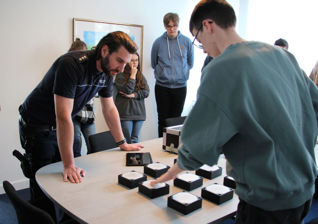Um Schnelligkeit ging es beim nächsten Test. Hier mussten die Schülerlotsen ihre Reaktionsfähigkeit unter Beweis stellen. Dazu mussten sie so schnell wie möglich auf jene Felder drücken, die aufgeleuchtet sind. Philipp Hörnig und auch Paul Grastat, der selbst schon den Landeswettbewerb der Schülerlotsen gewonnen hat, zeigten sich beeindruckt. „Ihr seid alle sehr dicht beieinander“, sagte Philipp Hörnig. Reaktionen von rund einer halben Sekunde waren Durchschnitt, was natürlich im normalen Straßenverkehr nicht möglich ist. „Da ist eine Reaktionszeit von einer Sekunde realistisch“, erklärte der Verkehrssicherheitsberater. Und das nur, wenn man nicht abgelenkt ist.