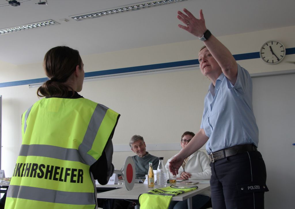 Auch in einem Rollenspiel wurden die einzelnen Wettbewerbsteilnehmer getestet. Katrin Grastat gab zu Anfang noch ein paar Tipps, wie „sich besonnen benehmen, entspannt bleiben“. Eins aus neun Rollenspielen durften die Schülerlotsen ziehen und mussten die Situation dann vor der Jury darstellen. Als herausfordernder Gegenpart trat Daniela Berghaus an, mal als Fahrradfahrer, der ohne Licht unterwegs ist oder als Gruppe älterer Schüler, die neben dem Schülerlotsen die Straße überqueren wollen. Die geprüften Lotsen meisterten die Situationen alle gekonnt, behielten die Nerven, blieben freundlich, aber konsequent.