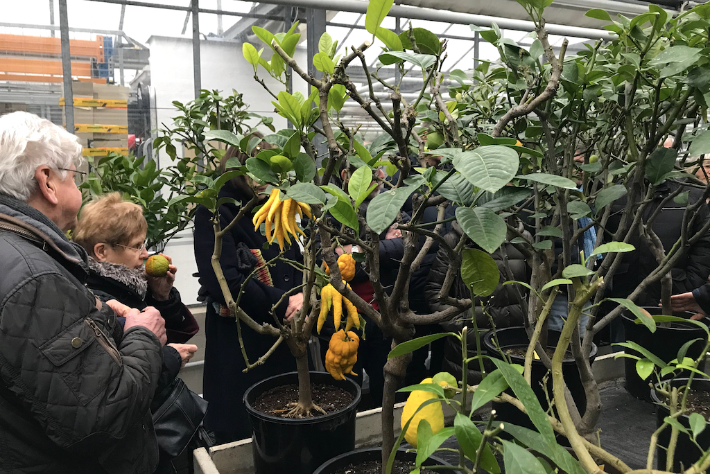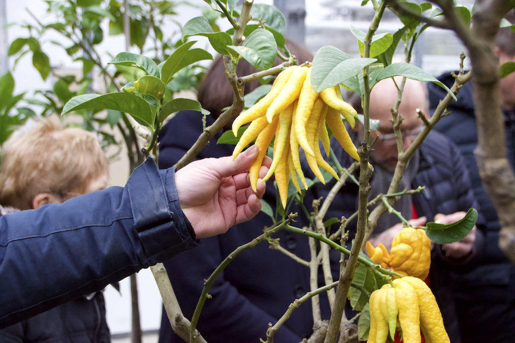 Besonders eindrucksvoll zeigten sich die leuchtend gelben Früchte einer „Citrus Medica“. Wie Hände mit zu vielen Fingern hängen die großen Früchte an den Ästen und sorgten auch für den Pflanzennamen „Buddhas Hand“. „Die Früchte werden in manchen Gourmet-Restaurants verarbeitet und erzielen auch schon mal Preise von 30 bis 50 Euro pro Stück“, wusste Preuhs zu berichten. Von dem besonderen, leicht bitteren, süßlichen Geschmack durfte sich das Publikum bei der Verköstigung selbst überzeugen. Der intensive, angenehme Duft der Frucht füllte augenblicklich das gesamte Kalthaus.