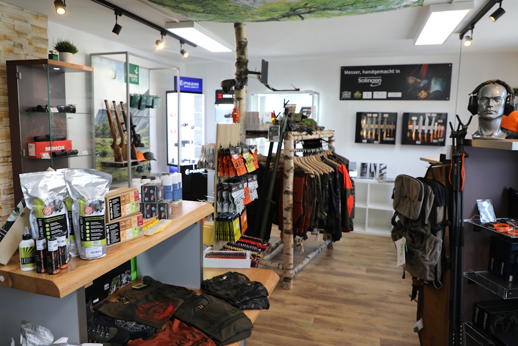 Groß ist zudem die Auswahl an Ausrüstung für Aktivitäten in der Natur: Jagdbekleidung für jede Jahreszeit und Witterung, robuste Schuhe und funktionale Outdoor-Ausrüstung sind fester Bestandteil des Sortiments. Besonders hervorzuheben ist die Auswahl an Jagdmessern, Schleifgeräten und Produkten zur Wildbergung und -verarbeitung. Darüber hinaus finden sich im Angebot auch Drohnen, Wildkameras, Lockmittel, Revierbedarf sowie Küchenzubehör und Geschenkideen – stets mit dem Blick auf praktische Anwendbarkeit im jagdlichen Alltag. „Jetzt, wo wir größere Räume und auch ein Ladenlokal haben, ist unser Sortiment noch einmal deutlich angewachsen“ freut sich Tim Böddinghaus.