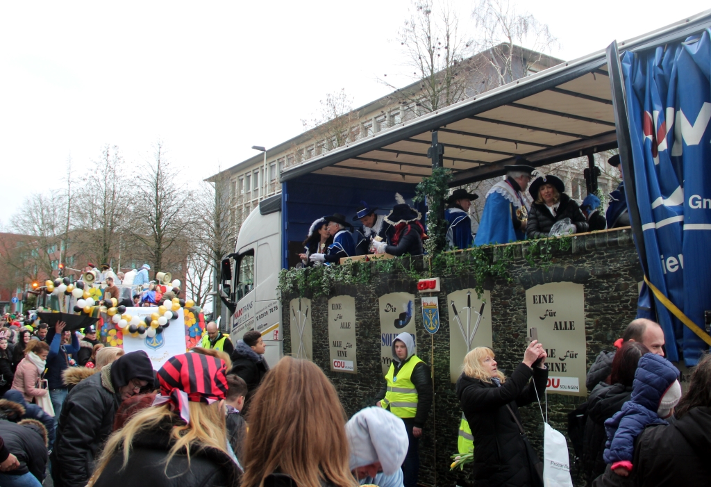 Es beteiligten sich auch mehrere weithin bekannte Solinger Jecken am Rosenmontagszug. Oberbürgermeister Tim Kurzbach – wieder unterwegs im eigenen städtischen Festwagen – griff selbst zum Mirkofon und sang zwischen dem Verteilen von „Strüßer“ und „Kamelle“ vom Wagen aus gelegentlich ein Karnevalslied mit. Auch Bürgermeister Ernst Lauterjung, Ex-Oberbürgermeister Franz Haug und Dagmar Becker, Beigeordnete für Jugend, Schule, Integration, Kultur und Sport, waren an diesem Rosenmontag in närrischer Mission unterwegs. Viele weitere Vertreter aus Politik und Gesellschaft der Klingenstadt hatten sich ebenfalls angeschlossen.