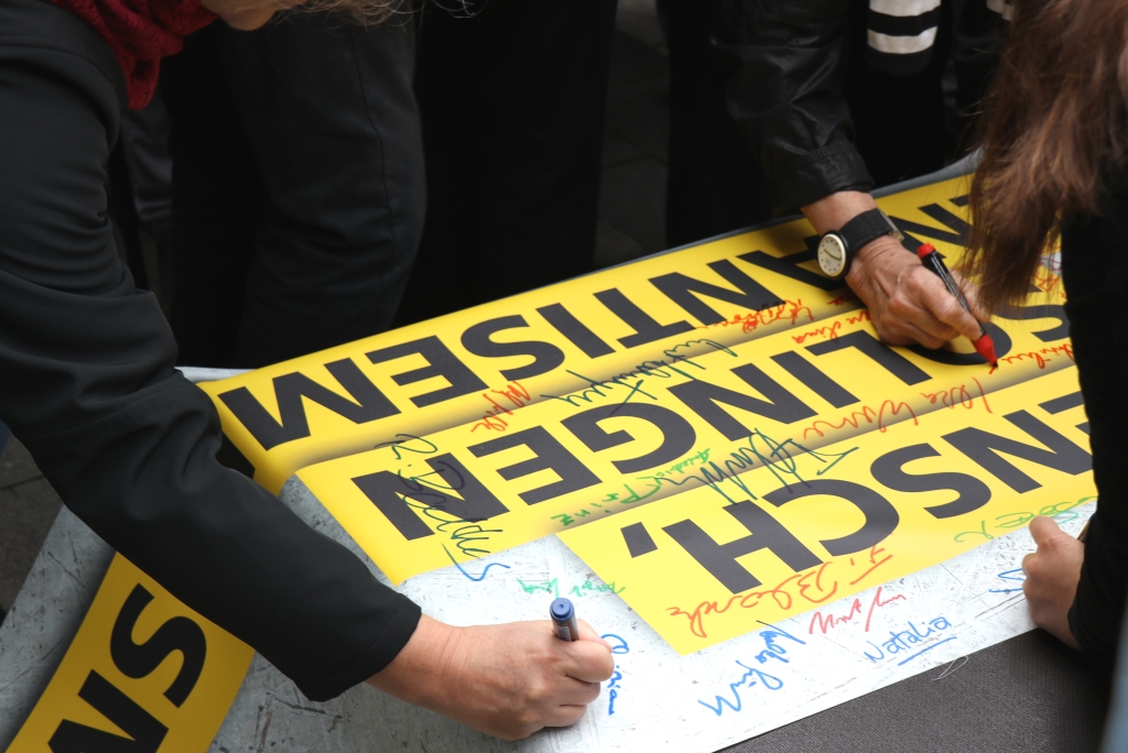Alle Redner waren sich darin einig, dass man die Gefahren des Rechtextremismus nicht kleinreden dürfe und noch ernster nehmen müsse. Zum Abschluss der Veranstaltung vor dem Rathaus haben zahlreiche Teilnehmer auf einem Transparent mit der Aufschrift „Mensch, Solingen gegen Antisemitismus“ unterschrieben.