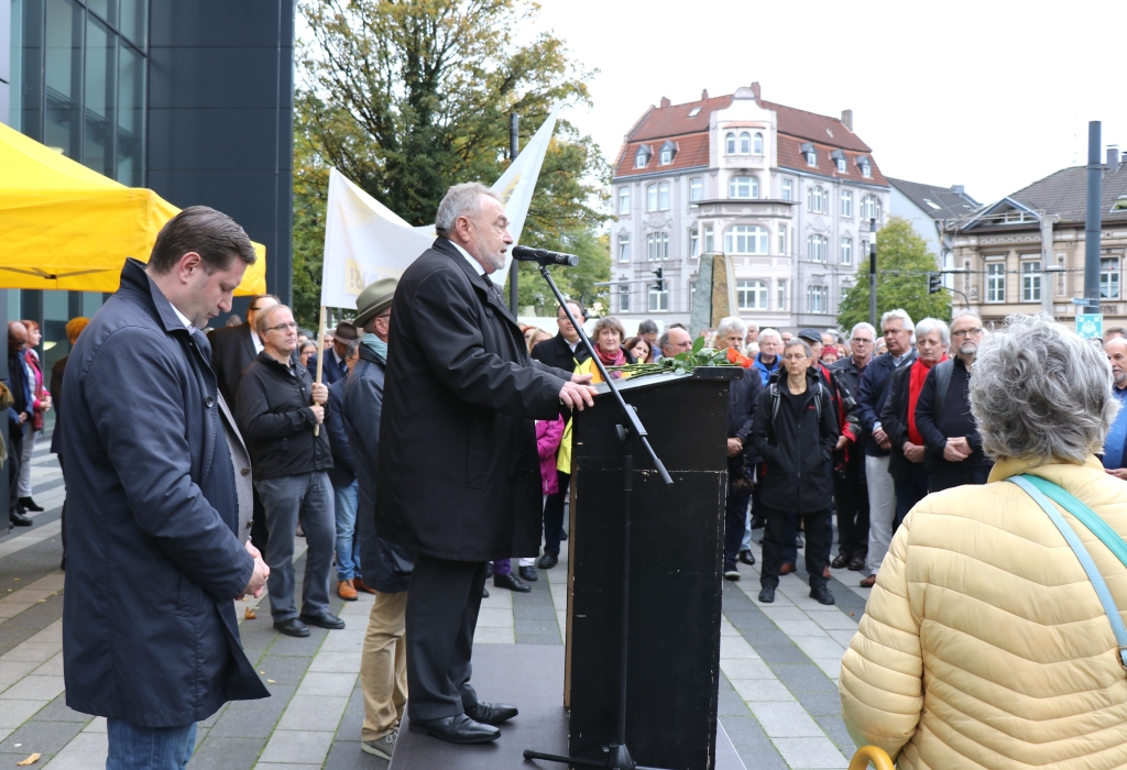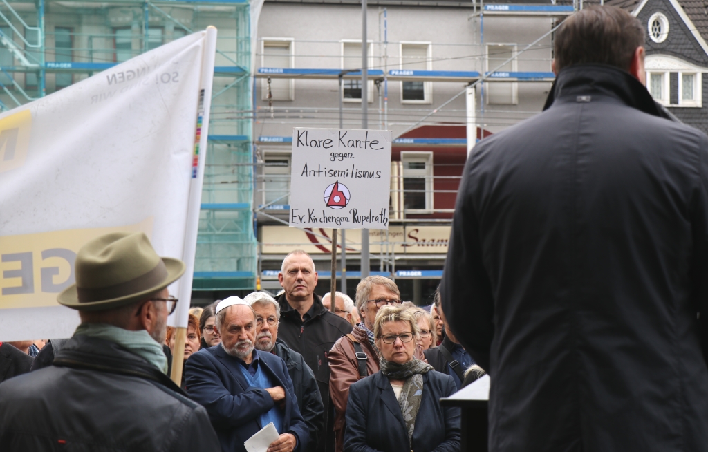 Rechtsradikale Gewalt sei nicht nur im Osten Deutschlands gegenwärtig, so Kurzbach weiter. „Es ist nicht weit weg, derartiges geschieht überall“, mahnte der OB. Er forderte die Versammelten zu einem „Aufstand der Anständigen“ auf. „Es tut wirklich gut zu wissen, dass wir so viele Freunde und so viele Unterstützer haben, im Bergischen, in Solingen, in Wuppertal und auch in Remscheid“, sagte Leonid Goldberg, Vorsitzender der Jüdischen Kultusgemeinde Wuppertal. Er berichtete von zahlreichen E-Mails und Anrufen mit Solidaritätsbekundungen von Politikern, von Wohlfahrtsverbänden, von Kirchen, auch von Vertretern einer Moschee, die ihn seit dem Doppelmord in Halle erreicht haben.