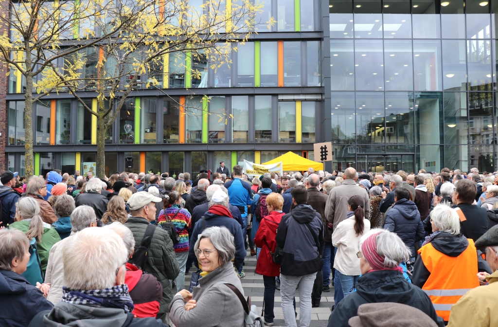 SOLINGEN (bgl) – Vor dem Hintergrund des antisemitisch motivierten Mordanschlags in Halle a.d. Saale, bei dem vorgestern ein Rechtsradikaler zwei Menschen kaltblütig erschoss, riefen jetzt die Stadt Solingen, die Jüdische Kultusgemeinde Wuppertal, das Bündnis Bunt statt Braun und die Arbeitsgemeinschaft Christlicher Kirchen zu einer Gedenk- und Solidaritätsveranstaltung auf. Rund 500 Solingerinnen und Solinger kamen am Freitagnachmittag auf den Walter-Scheel-Platz und setzten ein deutliches Zeichen gegen Antisemitismus und Fremdenhass. „Was in Halle geschehen ist, ist unfassbar und geht einem unter die Haut. Bei uns im Lande werden Menschen jüdischen Glaubens mit dem Tode bedroht und angegriffen, es ist schrecklich“, sagte Oberbürgermeister Tim Kurzbach.