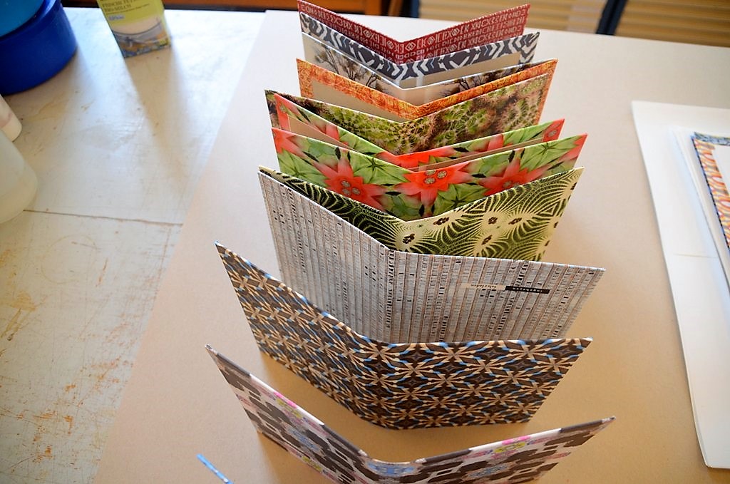 Buchbinderin Clara Schmidt von falz & faden hat ihre Notizbücher ausgestellt, ebenso die gerade angefertigten Serviettenkästen. „Diese Kästen habe ich neu ins Sortiment aufgenommen“, verrät sie. „Jedes Design ist in drei unterschiedlichen Größen erhältlich. Die Dekore sind auch untereinander gut kombinierbar.“ Diese Muster stammen aus der Reality Pattern Serie der Designerin Inge Heyen (wir berichteten). Sie entnimmt typischen Solinger Motiven winzige Details und gestaltet sie am PC zu außergewöhnlichen Designs. Unter dem Namen „Heimliche Liebe“ verarbeitet eine Gruppe Solinger Kunsthandwerker dieses Design in unterschiedlichen Werken.