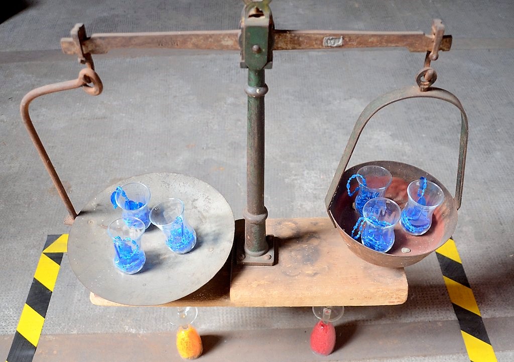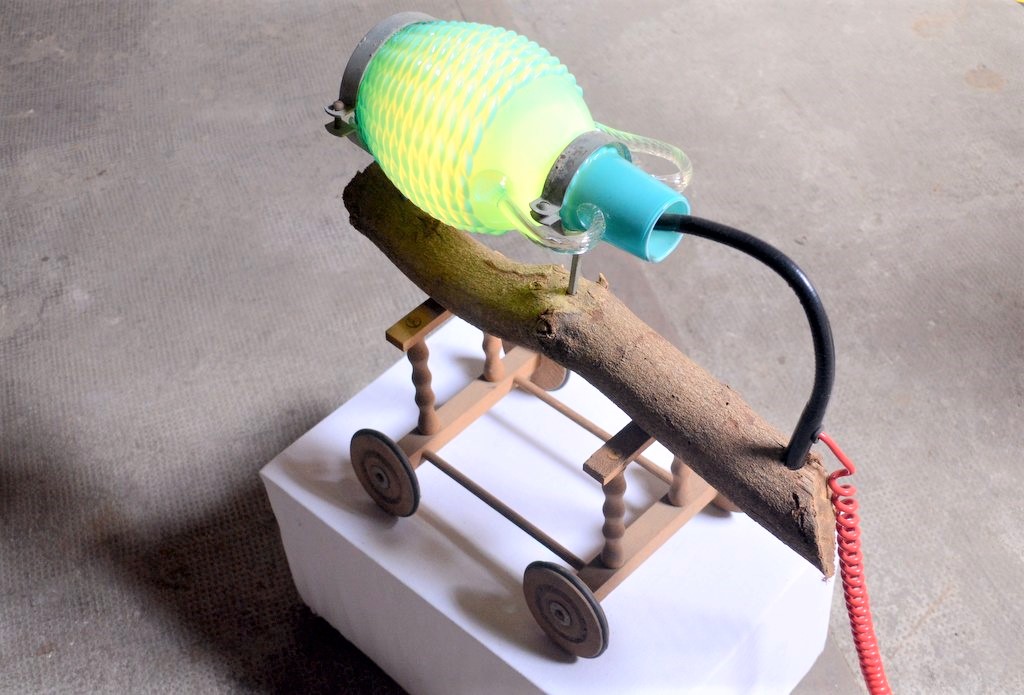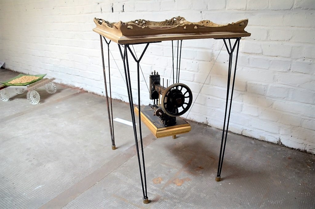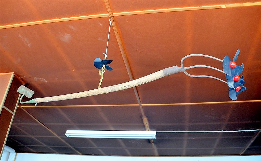 Dieter Suhr wirft einen etwas anderen Blick auf Alltagsgegenstände. „Oft sind es abgenutzte, teilweise schon entsorgte Gegenstände. Daraus gestalte ich neue Objekte, bei denen die ursprüngliche Funktion keine Rolle mehr spielt.“ Ein Zusammentreffen von Dingen, die gar nicht zusammengehören. Seine Werke sind skurril und ein bisschen schräg. So wie die Air Fork One, die unter der Decke hängt. „Ich habe aus uralten Overhead-Projektoren die Lüfterräder ausgebaut. Mit der alten Mistgabel hat meine Mutter selbst noch im Garten gearbeitet.“ Ein ebenso spezielles Objekt ist die Lumen-Vase mit Dimmer. Sie besteht aus einer ausrangierten Vase, einen geschweiften Stück Holz und dem fahrbaren Untergestell eines Puppenwagens. Suhr ist, wie Homburg, ebenfalls Autodidakt. Er beschäftigt sich seit seiner Jugend damit, Dinge miteinander zu verbinden. Da wird geschraubt, geklebt und gelötet.