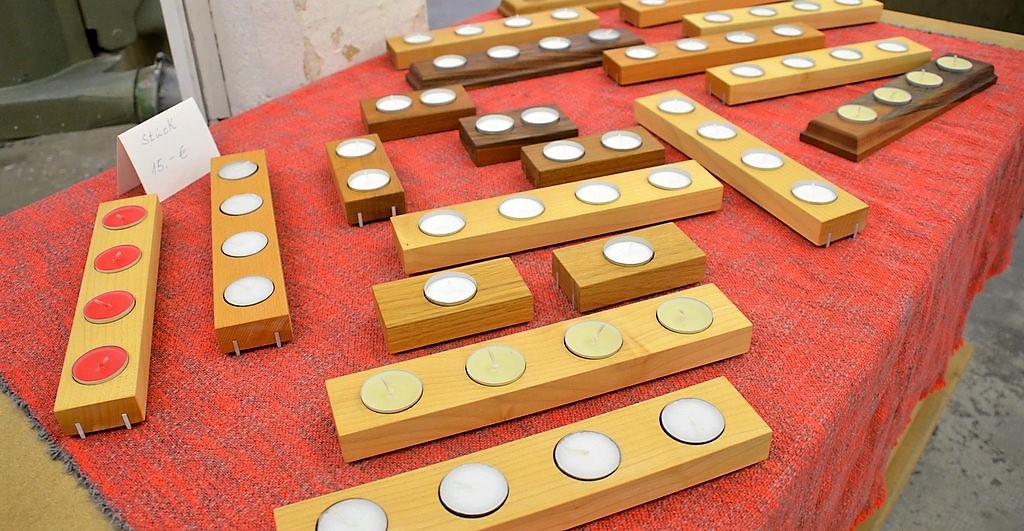 Der Auftragsschwerpunkt liegt bei Möbeln, Einbauschränken, Küchen und Büroeinrichtungen. Eines der Fotos zeigt einen exklusiven Empfangstresen, ein anderes eine edle Holzterrasse. Ein Tisch liegt voller Dekormuster. „Es gibt etliche hundert der unterschiedlichsten Dekore“, sagt Gerhards, „wir zeigen hier nur eine kleine Auswahl von Oberflächen.“ Gleich daneben sind verschiedene Hölzer zu interessanten Teelichthaltern verarbeitet. Für die Spielfreudigen gibt es das beliebte Solitär.