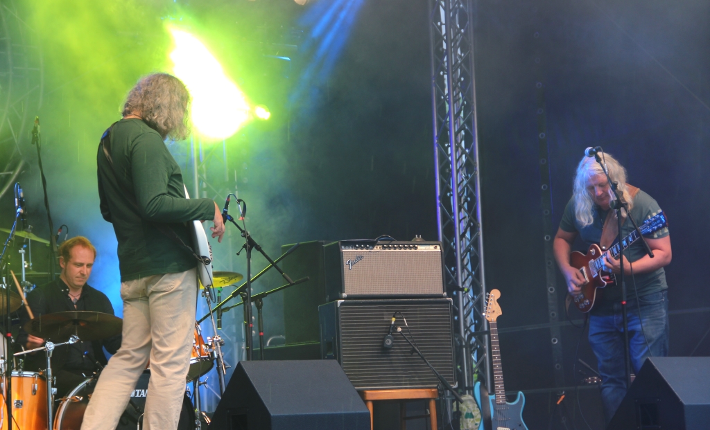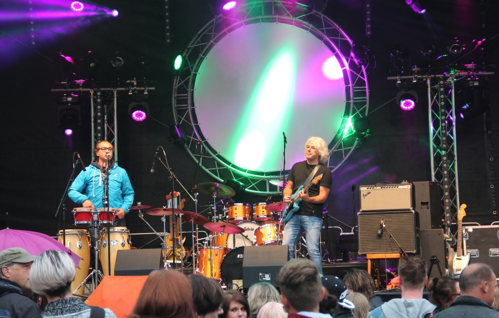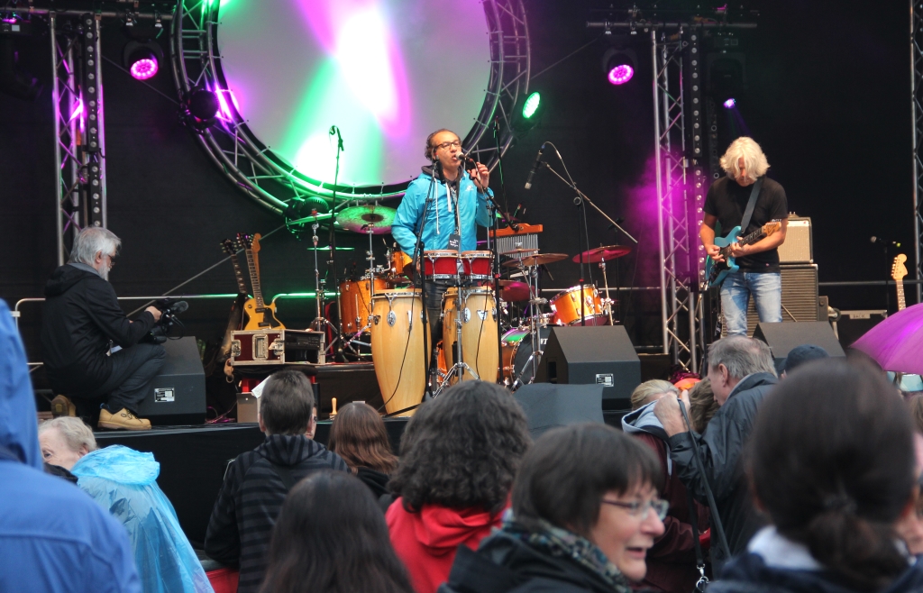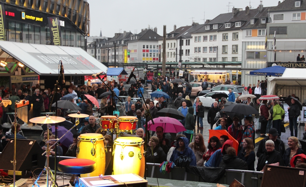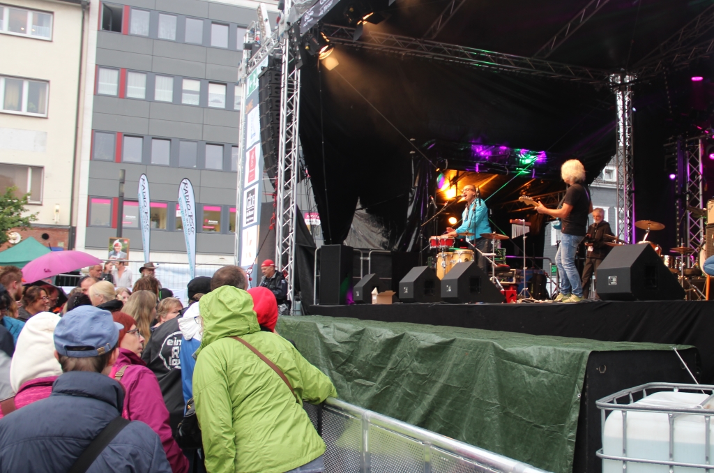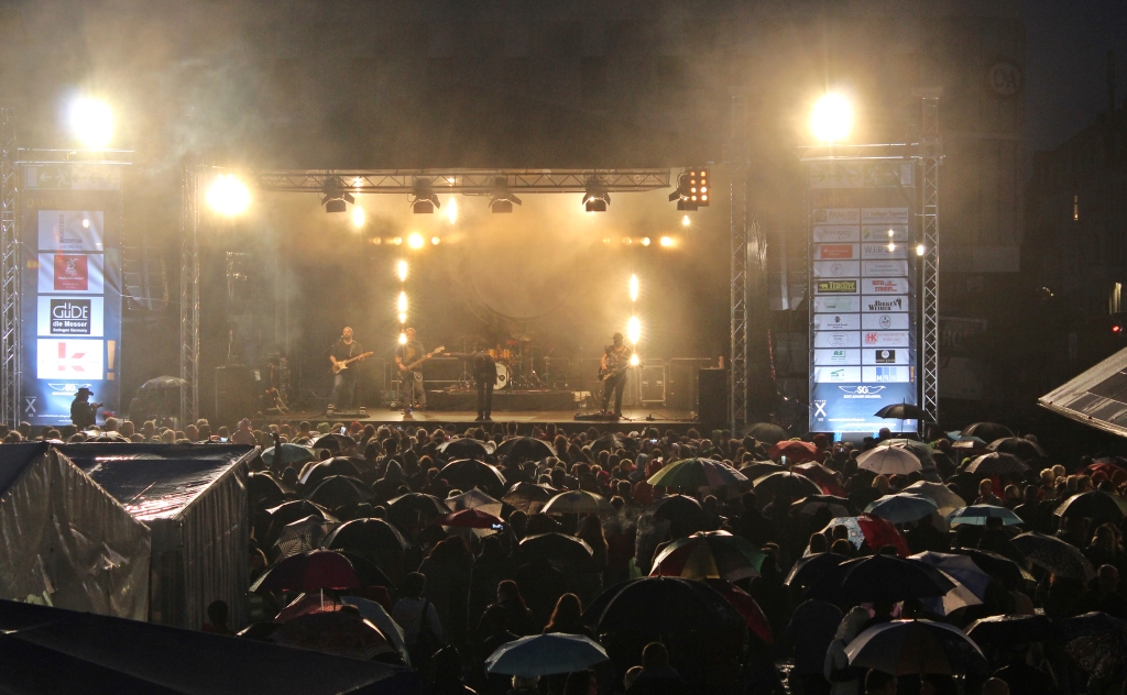 „Regen und Blues gehören nunmal zusammen“, kommentierte Musikkoordinator Philipp Müller Wetter und den Auftritt der „Blueshunde“. Aber die Besucher, die bereits zum Start der Sommerparty auf dem Neumarkt waren, hatten allesamt ihren Spaß. Das änderte sich auch nicht, als gegen 19 Uhr „Hang out in the Trees“ die Bühne betrat und ihr musikalisches Potpourri abfeuerte.