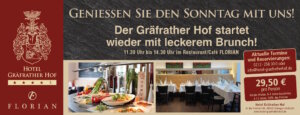 Das Café Florian im Hotel Gräfrather Hof startet wieder mit seinem Sonntagsbrunch. Los geht es am 29. März 2026, gefolgt vom Ostersonntag, 5. April 2026. Anschließend findet der Brunch regelmäßig an jedem ersten Sonntag im Monat statt. Serviert wird jeweils von 11.30 bis 14.30 Uhr im Café Florian in Solingen-Gräfrath.