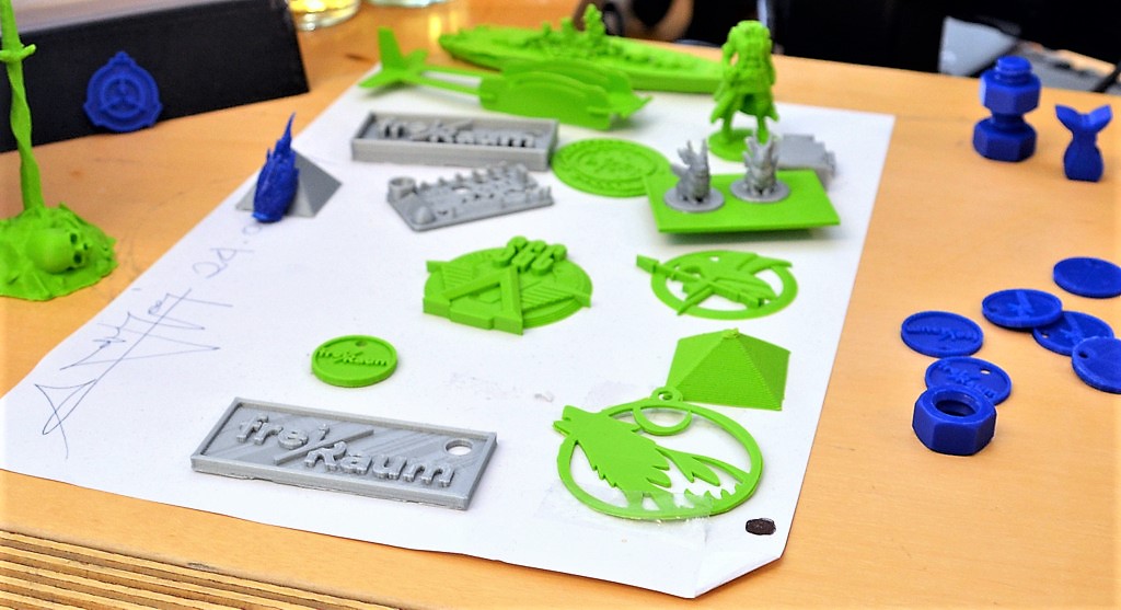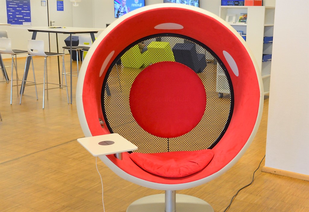 Ein absoluter Blickfang – der leuchtend rote ringförmige sonic chair. Er umhüllt den Hörer, der sich dadurch mitten in einem Klangzentrum befindet. Über eine Bluetooth-Schnittstelle kann man Smartphone, MP3-Player und Laptop anschließen und ein besonderes Musik- und Klangerlebnis genießen. Der 3D-Drucker mit Scanner stößt schon jetzt auf reges Interesse. Zum Preis von einem Euro pro Stunde können kleinere Objekte dreidimensional ausgedruckt werden. Wer mag, bringt ein eigenes Modell zum Einscannen mit.