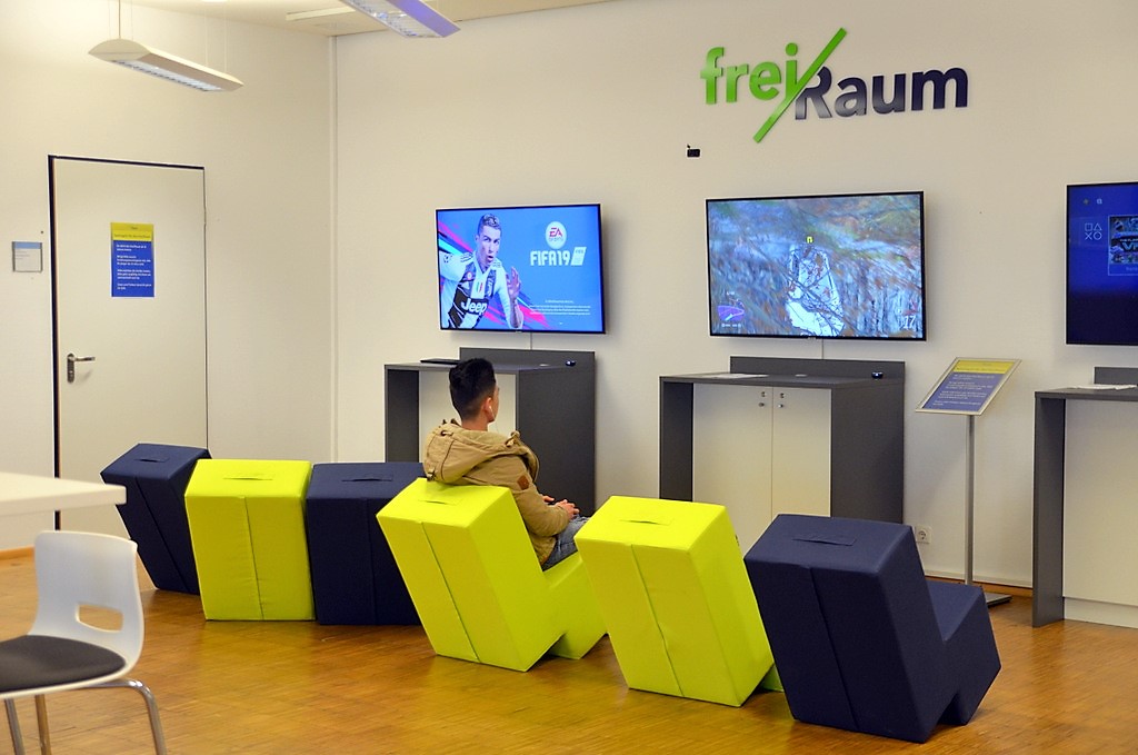 Vor allem der frei/Raum im Erdgeschoss, früher Internet-Café, bietet mit seinem offenen Gaming-Bereich für Jugendliche ab zwölf Jahren einen Ort zum Ausprobieren der virtuellen Welt. PS4, Xbox One und Virtual Reality Brillen warten auf ihren Einsatz. Man kann allein spielen oder sich in Gruppen beim Gaming messen.