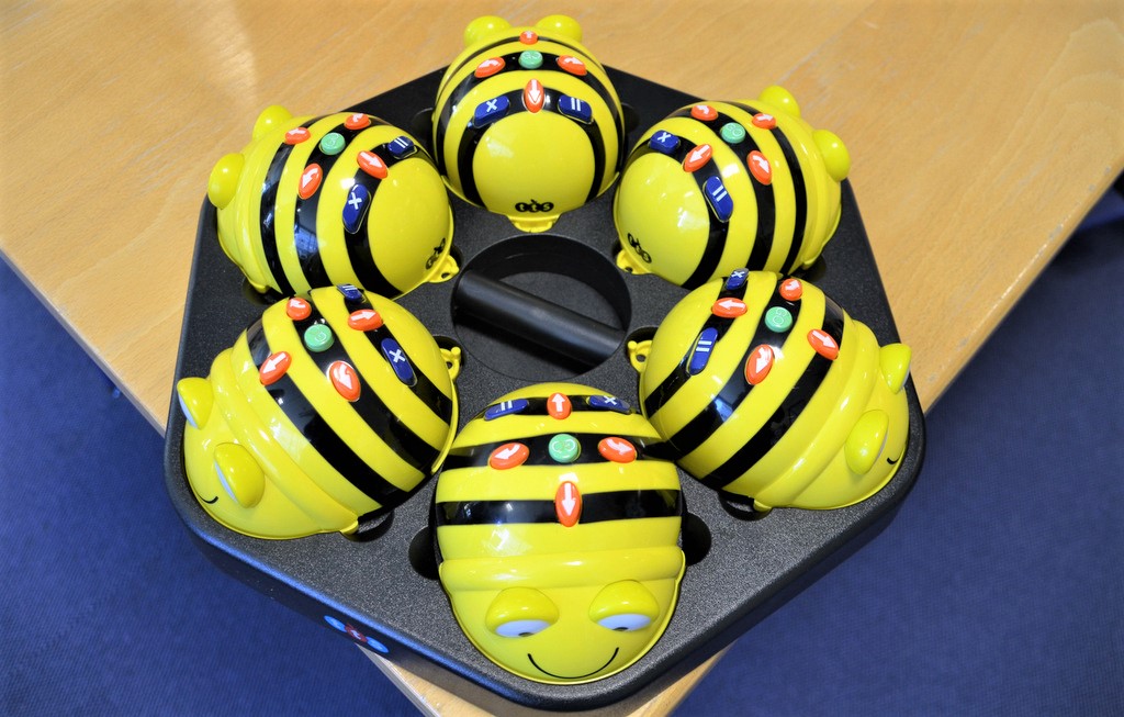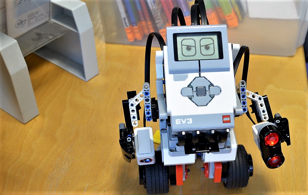 In der Kinderbibliothek findet sich ein 32-Zoll großer Touchtable, auf dem zahlreiche Lernspiele zur Verfügung stehen. Großen Anklang finden die zwölf Bee-Bots, die seit kurzem im Einsatz sind. „Die Kinder sind begeistert“, sagt Mitarbeiterin Jessica Mach und demonstriert die Funktionsweise. Die übergroßen Bienen bieten schon für Kindergartenkinder die ersten Schritte in die Programmierung. Roboter LEGO Mindstorms EV3. Makey Makey und Raspberry Pi sind ebenfalls dazu bestimmt, erste Kenntnisse in der Programmierung zu ermöglichen, auch die App „ScratchJr“, die auf den iPads installiert ist. Hier werden Kinder durch den Einsatz von modularen Bausteinen an die Thematik herangeführt. Sie bewegen Figuren, lassen sie hüpfen und sprechen. „Viel Spaß, gepaart mit einem großen Lerneffekt“, schildert Jessica Mach ihre Erfahrungen dazu.
