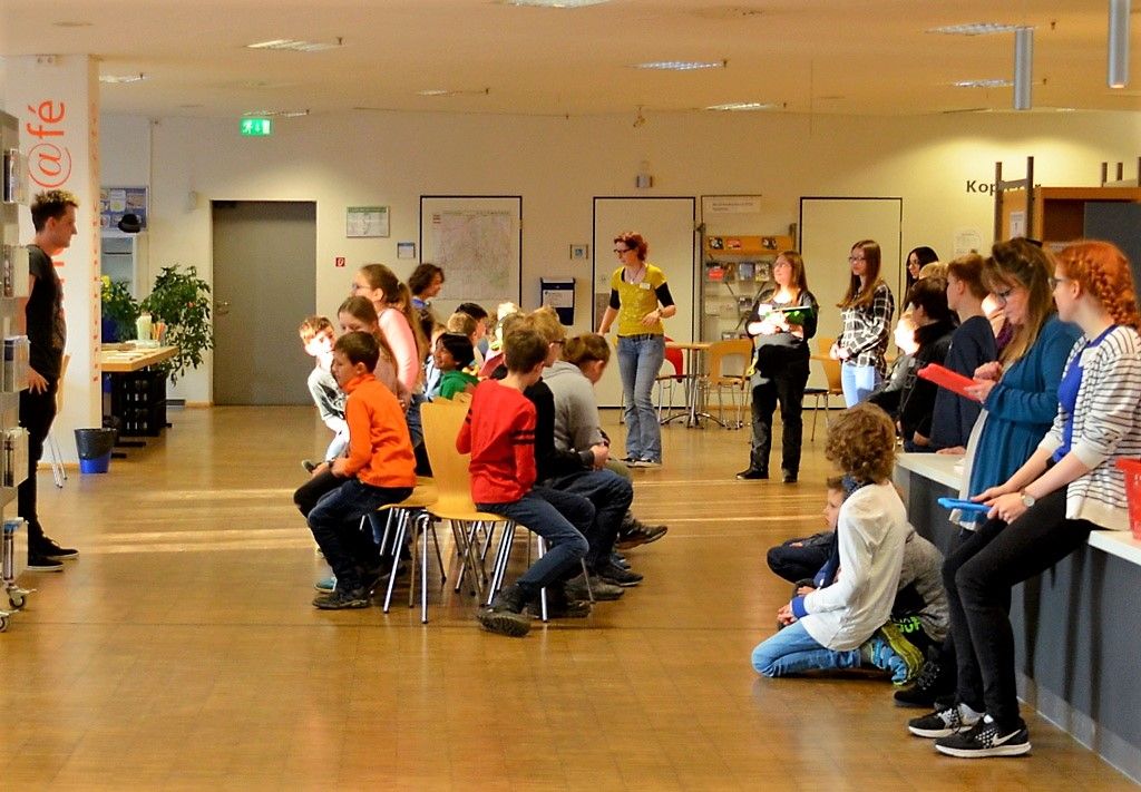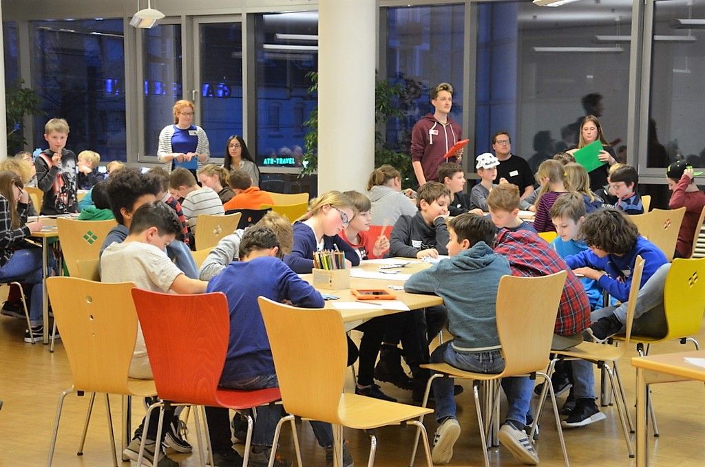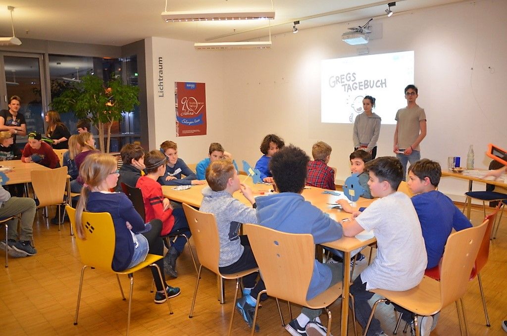 Zu Beginn des Abends konnten 45 Fünft- und Sechstklässler erst einmal bei der „Reise nach Jerusalem“ ihre Schnelligkeit unter Beweis stellen. Dann gab’s einen kurzen Überblick über den Abend. Aufteilung in vier Gruppen, die alle an vier Stationen unterschiedliche Aufgaben erfüllen mussten. Dazu hörten sie einen kurzen Text aus Gregs Tagebuch, der wichtige Hinweise zu den Lösungen gab. Wertvolle Unterstützung leisteten hierbei die ehrenamtlichen Vorlesepatinnen Uschi Müller und Wiebke Pelz.