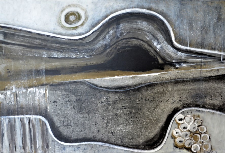 Zu ihrer Malerei sagt die Künstlerin: „Meine Bilder werden häufig nicht so, wie ich es mir vorgestellt habe. Ich probiere gerne aus und mache immer wieder etwas anderes.“ Acht Bilder hat sie für die Ausstellung mitgebracht, darunter zwei interessante Strukturbilder aus Limonadenflaschendeckeln, zerschnittenen Klopapierrollen, Seidenpapier und Acrylfarbe. Ein anderes Werk ist mit mehreren Schichten Marmormehl entstanden, auf die Akzente mit Acrylfarbe gesetzt wurden.