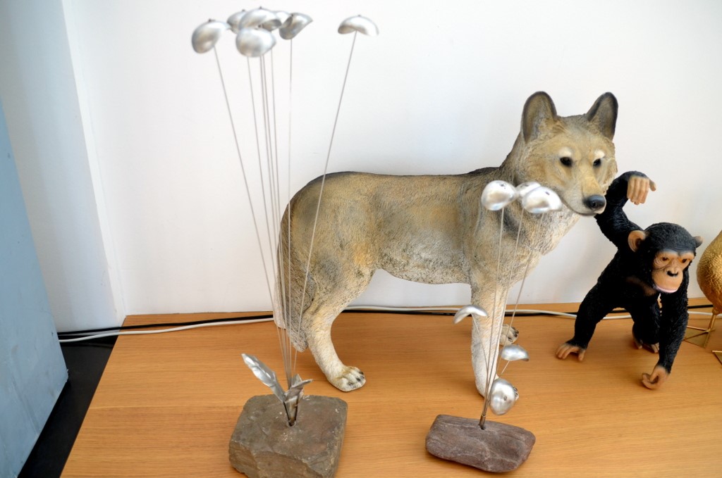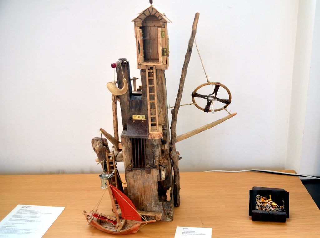 Künstler Peter Amann vom Atelier Pest-Projekt hat für die Ausstellung ganz besondere Skulpturen ausgewählt. Seine Werke bestehen meist aus Holz und Stahl. Er setzt Fundstücke zusammen und verbindet Kunst mit Handwerk.