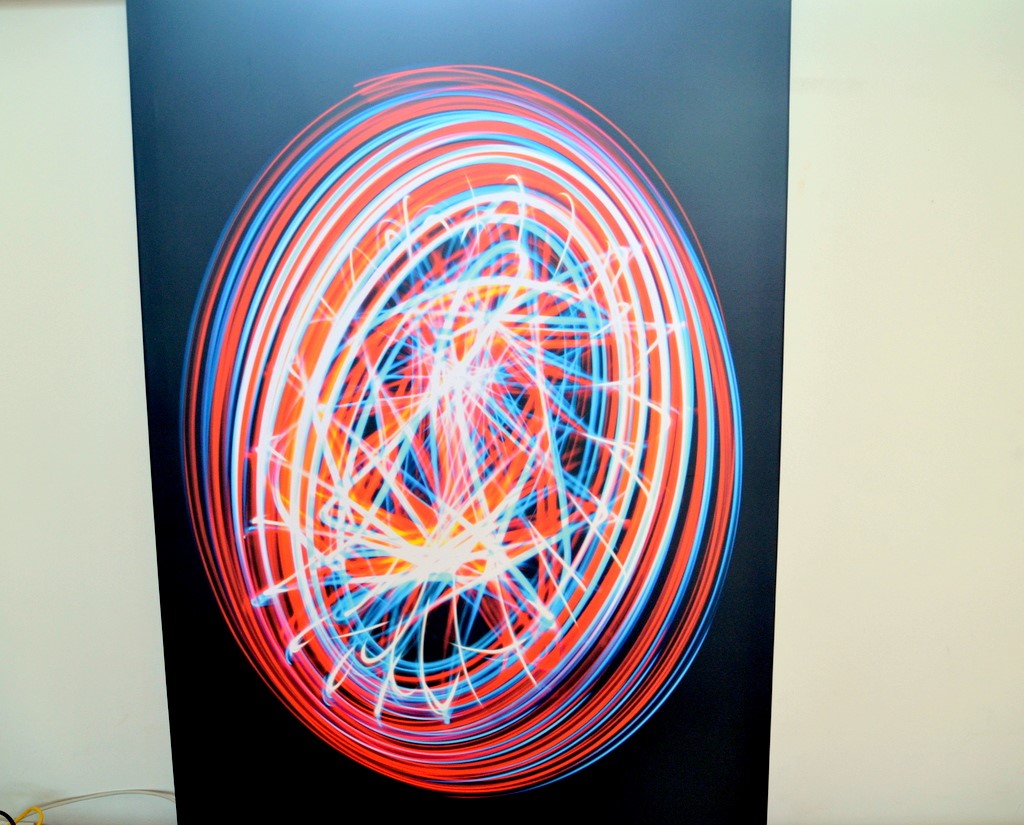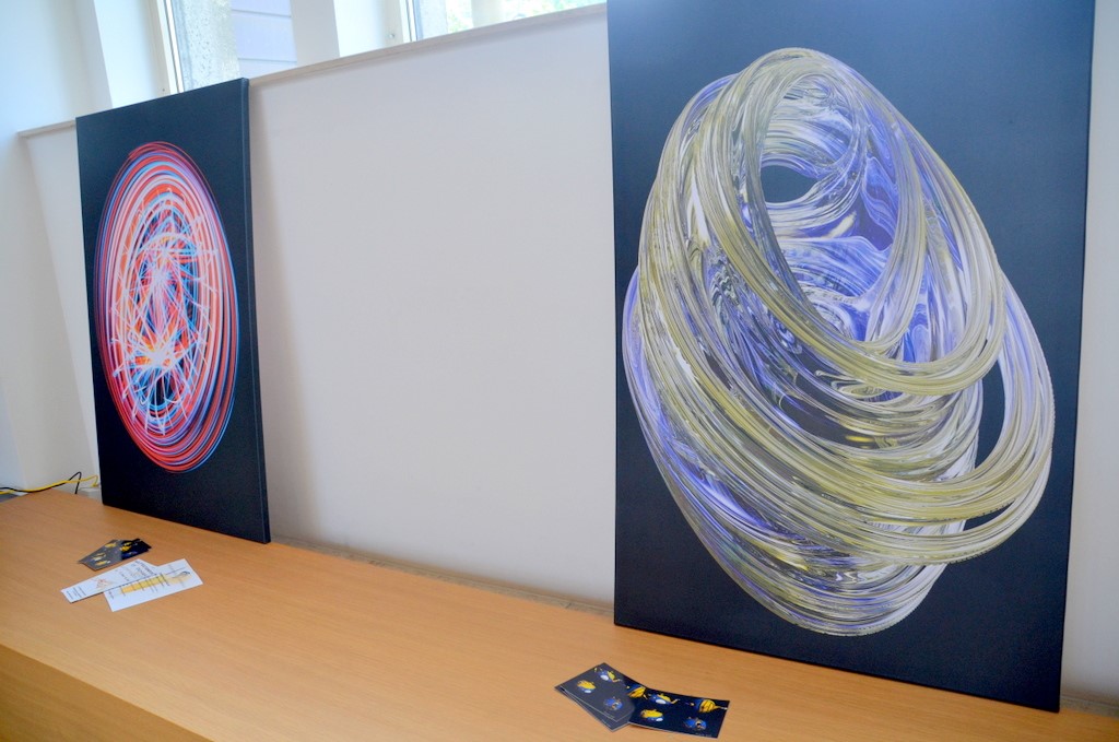 „Einerseits fotografiere ich und andererseits erschaffe ich selbst Objekte am Rechner“, erklärt Voß und überlegt, ob diese Beschäftigung, der er extrem viel Zeit widmet, noch als Hobby gilt. Er hat vier großformatige Bilder (80 x 120 cm) mitgebracht, von denen nur eins auf der Grundlage eines Fotos entstanden ist. „Die anderen drei Objekte existieren in der realen Welt gar nicht“, erläutert er seine Arbeiten. „Sie entstehen ohne Vorlagen am Computer.“ Sein Lieblingsbild wird erst bei starkem Lichteinfall sichtbar. Es erinnert an das Kunstwerk „Die Kerze“ von Gerhard Richter.