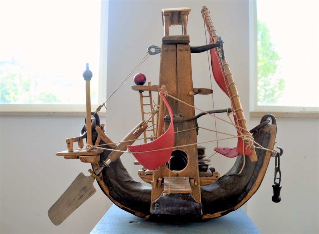 „Die in meinen Objekten verwendeten Fundstücke erzählen ihre Geschichten, kommen zusammen und werden zu einer neuen. Kunst und gutes Handwerk verbinden sich“, erklärt Amann. So wie beispielsweise sein Nilschiff. Die Grundform ist aus einem Kumt (oder Kummet) gemacht, das früher dazu benutzt wurde, Zugtiere einzuspannen. Das Teil besteht aus Leder und einem gebogenen Stück Holz. Komplettiert hat Peter Amann das Schiff mit mehreren Fundstücken Holz. „Das Schiff ist so gebaut, dass man, um alles zu sehen, ganz herum gehen muss“, erklärt Amann. Der Betrachter kann nicht das ganze Teil auf einmal erfassen. Wer genau hinsieht, entdeckt als kleinen Gag in der Takelage des Schiffes eine kleine Biene. Es ist Willy, der Freund von Biene Maja.