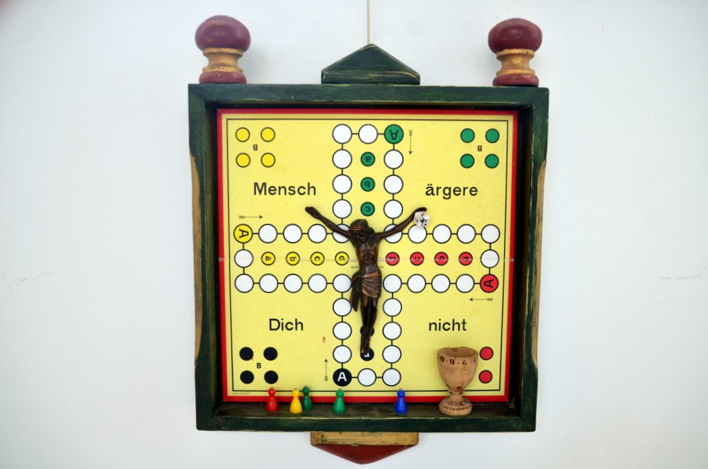 Provokant wirkt eine Jesusfigur auf einem Mensch ärgere Dich nicht Spielbrett. Den Titel „Gott würfelt nicht“ hat der Künstler von Einstein übernommen, der überzeugter Atheist war. Hier verknüpft der Künstler unabänderliche Naturgesetze der Physik mit der Entscheidungsmöglichkeit des Menschen. Der Weg auf dem Spielbrett ist der Weg des Menschen zu einem Ziel. „Die Menschen wandern durchs Leben, haben den Gral vor Augen. Sie suchen nach dem Glück und vergessen, dass man es nur finden kann, wenn man nicht danach sucht.“ Amann beschäftigt sich seit vielen Jahren mit dem Zen-Buddhismus und hat dadurch im Leben eine große Zufriedenheit gefunden. „Ich will mit meiner Kunst nicht provozieren“, betont er. „Ich mache Kunst, um daraus zu lernen.“