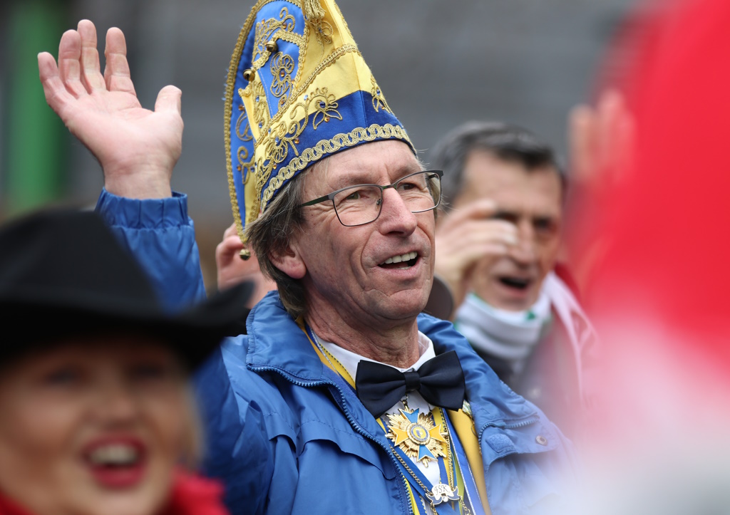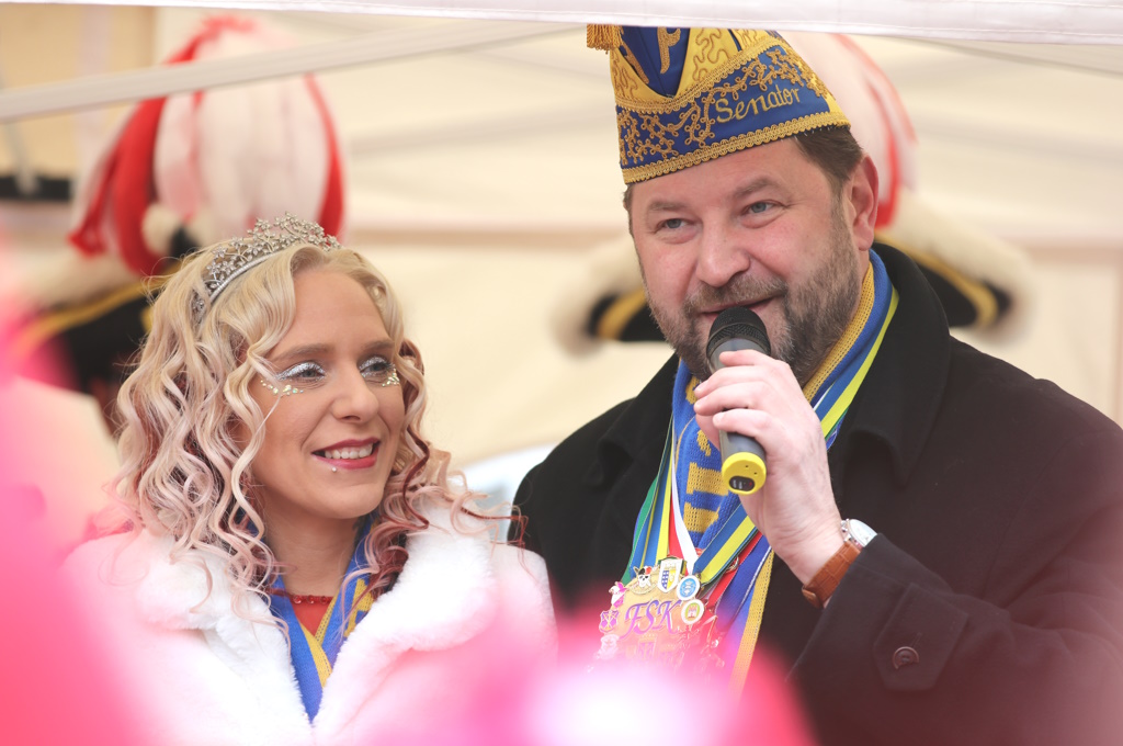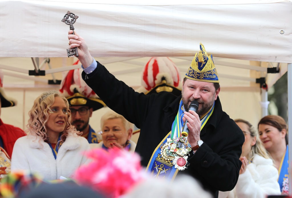 SOLINGEN (bgl) – Auch wenn dieser Satz allzu oft bemüht wird, so passt er doch auf das diesjährige Einläuten des Straßenkarnevals allemal: Wettergott Petrus hatte die Narrenkappe auf und meinte es gut mit Solingens Närinnen und Narren, als am Donnerstagvormittag pünktlich um 11.11 Uhr die Damen der Schöpfung das Regiment übernahmen. Oberbürgermeister Tim Kurzbach überreichte Solingens Prinzessin Jacky I. den symbolischen Schlüssel zum Rathaus, für heute sind die Herren – und damit auch Prinz Markus II. – abgemeldet.