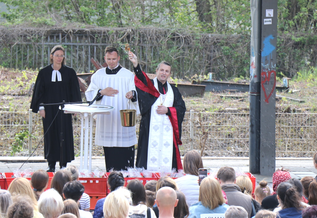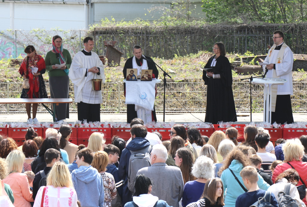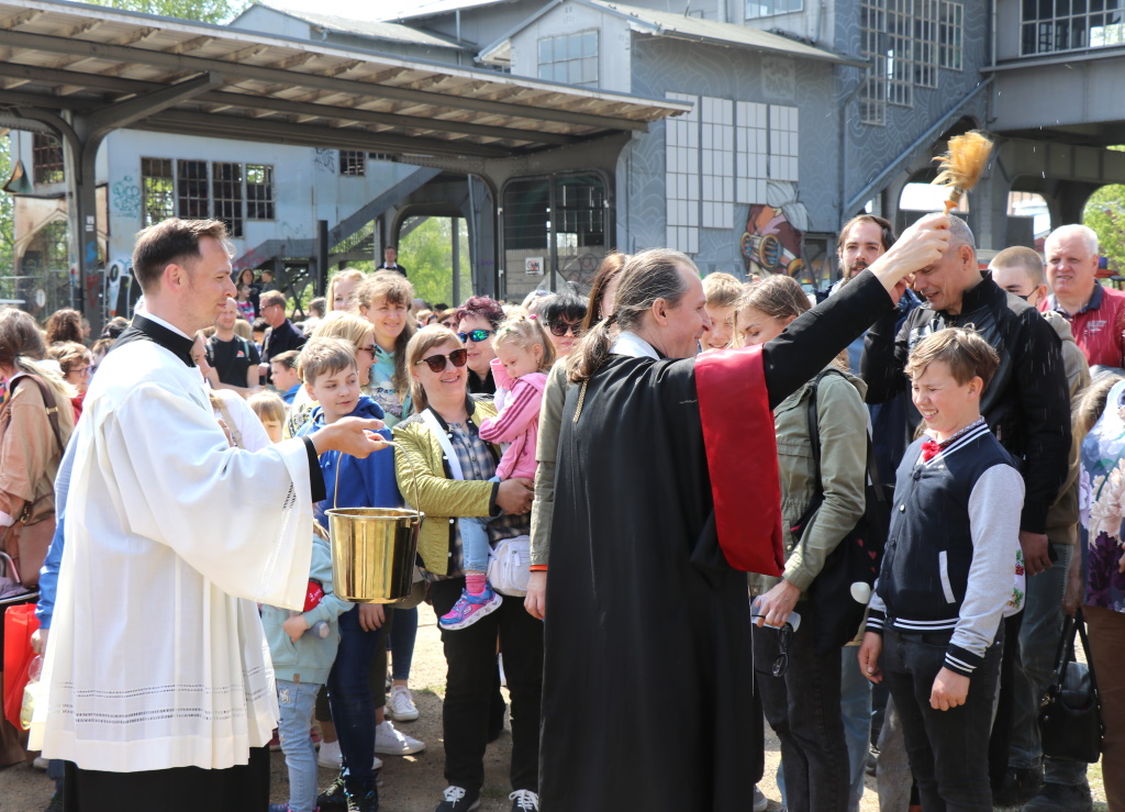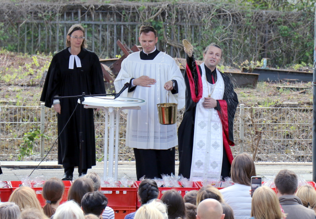 Auf die Idee, dass sich Solingerinnen und Solinger gemeinsam mit Flüchtlingen aus der Ukraine einen schönen Nachmittag machen konnten, kamen Daniela Hermes und Olena Tanchynets, die zahlreiche Kooperationspartner für ihr Vorhaben gewinnen konnten. Die Messe hielt Sonntagmittag Erzpriester Volodymyr Chayka, Dekan der ukrainisch-orthodoxen Kirche, Patriarchat Kiew, mit Sitz in Köln, gemeinsam mit katholischen und evangelischen Geistlichen im „Amphitheater“, dem Vorplatz des alten Bahnhofs direkt neben den Güterhallen. Die Messe war außerordentlich gut besucht, die Ränge gegenüber dem Gleis waren voller Menschen, darunter ganz viele Kinder.