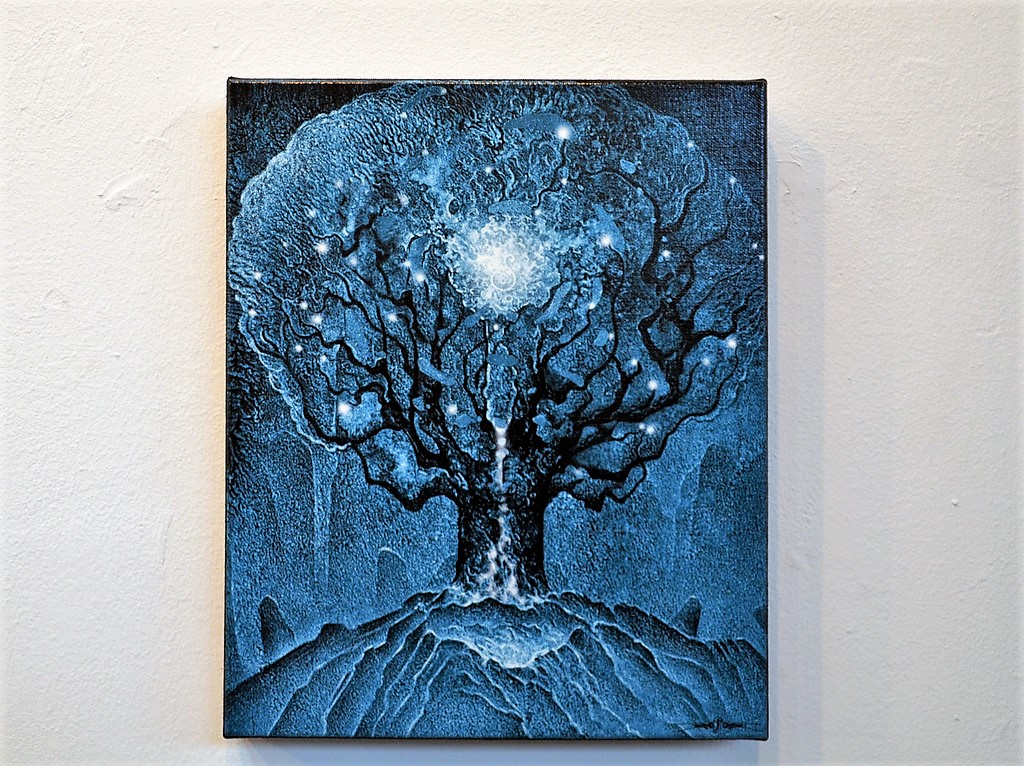 Künstler Ingo Schleutermann arbeitet, ebenso wie die verstorbene Künstlerin, im Bereich der visionären Kunst. Seine Farbstiftzeichnung spiegelt die Endphase der Künstlerin wieder, in der sie bereits eine gewisse Todessehnsucht zeigte. (Foto: © Martina Hörle)