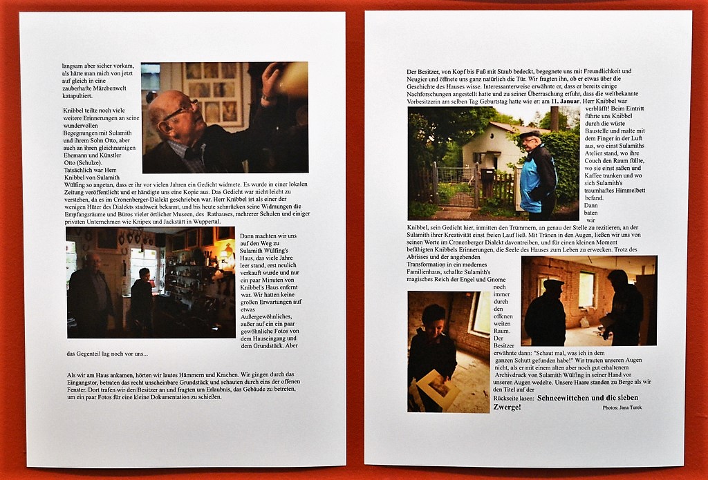 Edwin Markert hatte es sich als Zeitzeuge nicht nehmen lassen, zur Ausstellung zu kommen. Er hat die Malerin von frühester Kindheit gekannt. „Dass sie eine Künstlerin war, haben wir früher nie wirklich zur Kenntnis genommen. Sie war eine Nachbarin. Man begegnete sich häufig und kannte sich gut. Sie war schlicht und einfach Sulamith Wülfing bzw. nach ihrer Heirat Sulamith Schulze.“ Später, zu Markerts Teenagerzeit, registrierte er doch die Künstlerin in ihr. “In Geschäften und Apotheken hingen Bilder und immer lagen Kalender von ihr für die Kunden aus.“ Markert hat über Wülfing ein Gedicht in Wuppertaler Mundart geschrieben, was er im Laufe des Abends vorträgt. Entstanden ist es am 1. Januar 2001, dem Geburtstag der Künstlerin. Für die Ausstellung hat er einige Originale zur Verfügung gestellt.