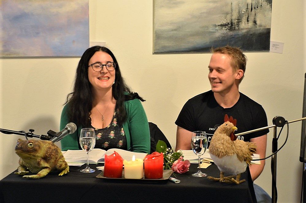 Am dritten Adventssonntag präsentiert Nadine Diab ihr erstes Kinderbuch „Tangotanz im Hühnerstall“. Unterstützt wird sie dabei von ihrem Freund Benjamin Heinz. Die beiden lesen mit verteilten Rollen. Ingo Schleutermann freut sich über den Erfolg der Jungautorin. Er hatte sie eingeladen, ihr Buch im Atelier KünstlerPack vorzustellen. (Foto: © Martina Hörle)