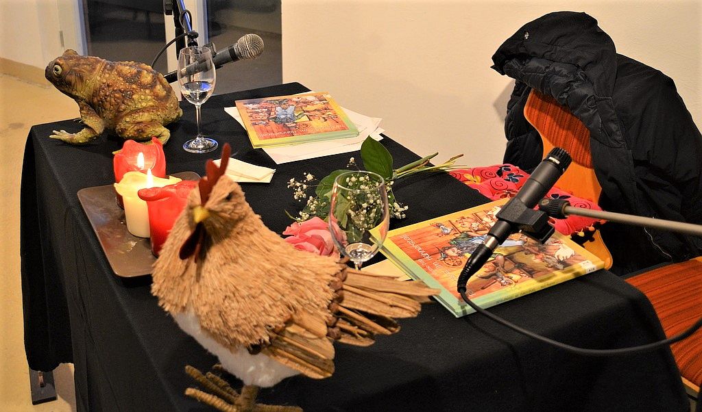 Zahlreiche Tiere haben hier ihren Platz gefunden, Tiere, die man im Buch wiederfinden wird. Die Kinder sind fasziniert. Vor dem Tisch stehen ein Paar große Einhornpantoffeln. Hund Keil hat riesige Beißzähne. Oskar, die Kröte und das Huhn Minerva haben sich auf dem Tisch direkt neben dem Buch niedergelassen. „Tangotanz im Hühnerstall“ dreht sich rund um Geschichten auf einem Bauernhof, dem Pimpelhof. Bauer Ewald ist ein ganz besonderer Mensch. Er spricht mit seinen Tieren.