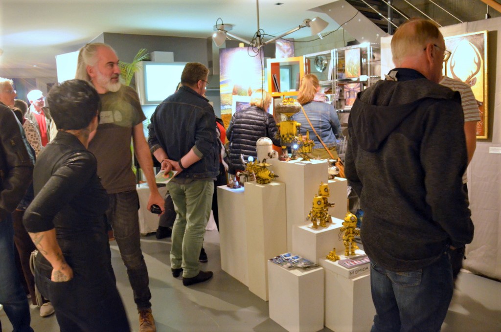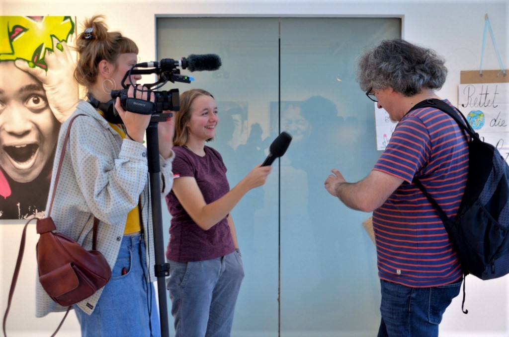 Galeristin Kirschey freute sich über die positiven Rückmeldungen: „In den ersten beiden Stunden waren schon rund 200 Besucher hier und haben sich die Ausstellung angesehen. Es gab sehr viel Lob für die gelungene Kombination und auch dafür, dass dieses ernste Thema durch die Umsetzung etwas leichter und dadurch zugänglicher wurde.“ Lenja, eine der Aktivistinnen, war ebenfalls vor Ort und interviewte diesmal selbst die Gäste. „Die Äußerungen waren durchweg zustimmend. Man fand es allgemein sehr gut, dass sich die Jugendlichen so engagieren. Auch die Gruppe Parents For Future ist für uns eine Riesenunterstützung.“ Das motiviert natürlich zum Weitermachen.