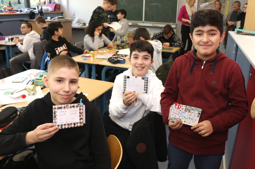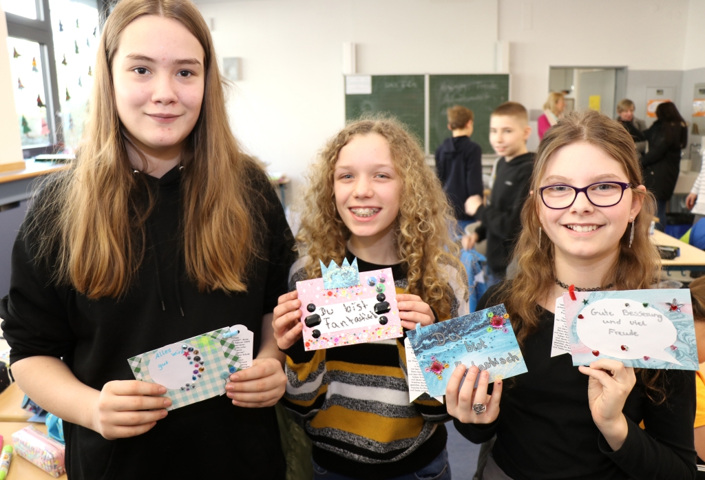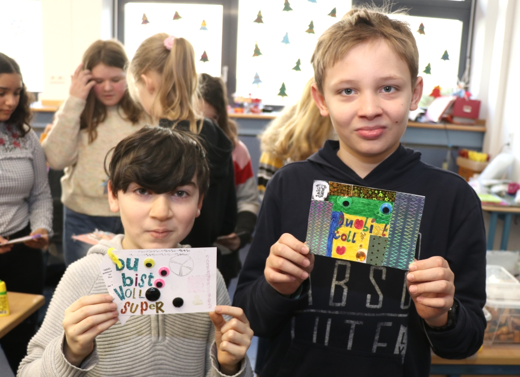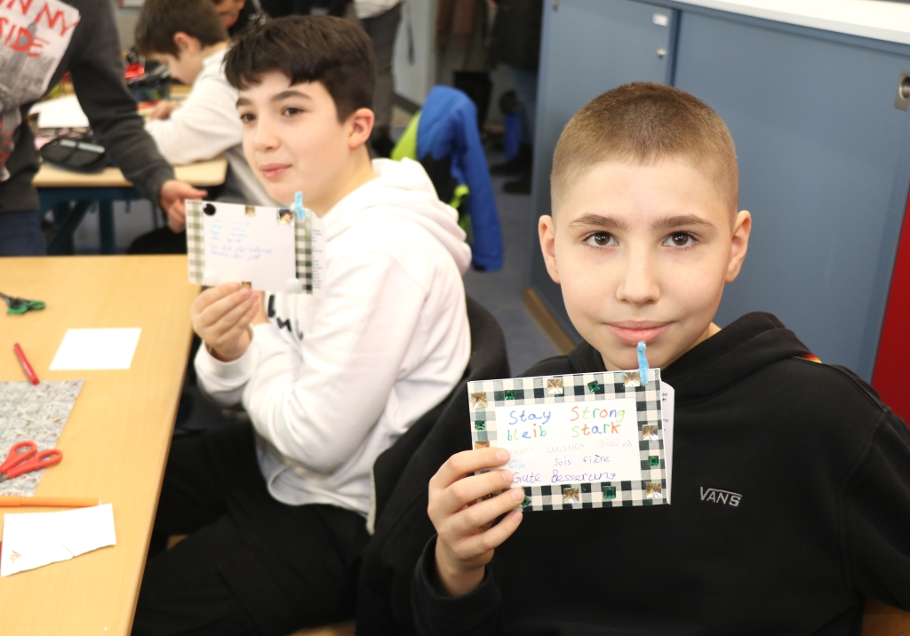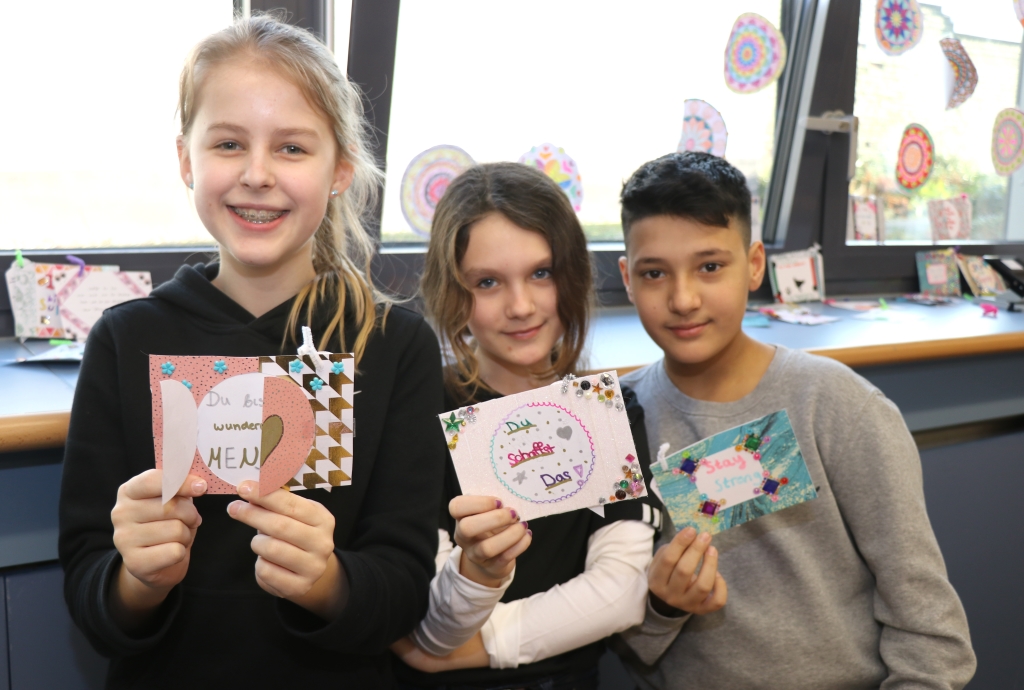 Mit guten Wünschen und Sprüchen sowie viel Bastelmaterial und Glitzer ging dann begeistert die Gestaltung los. Die Schülerinenn und Schüler gingen teilweise mit so großer Motivation ans kreative Werk, dass sie teilweise sogar die Pausen durcharbeiten wollten. Schon am ersten Tag wurden fast 80 Grußkarten fertig gestellt.