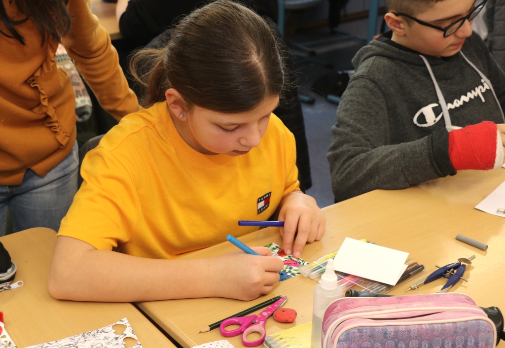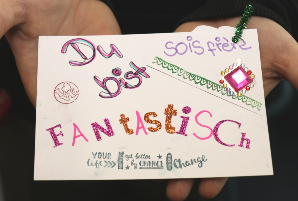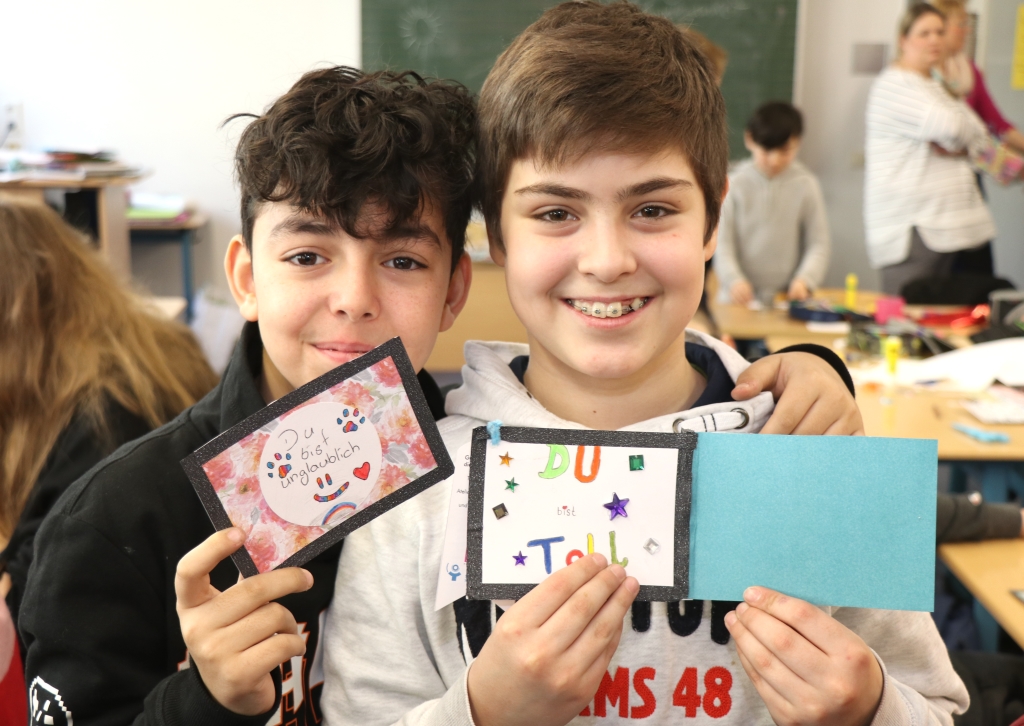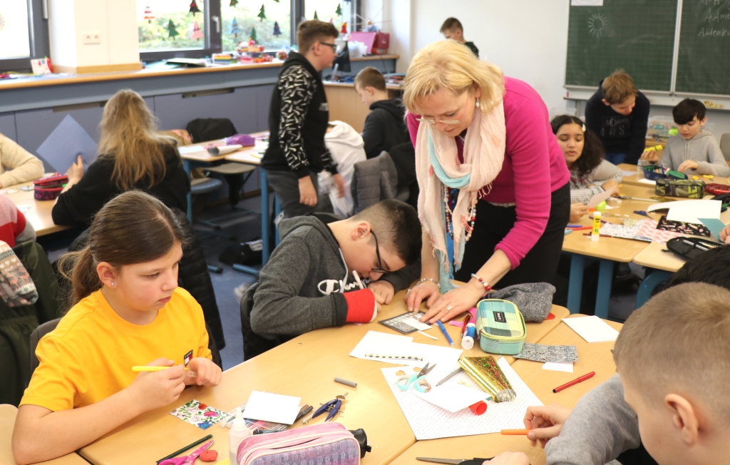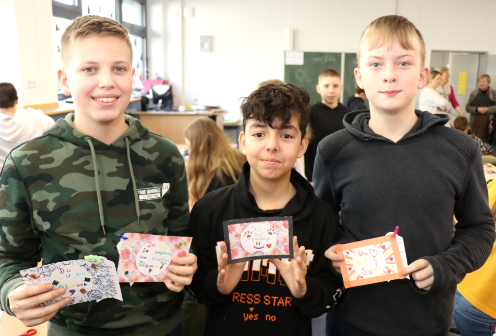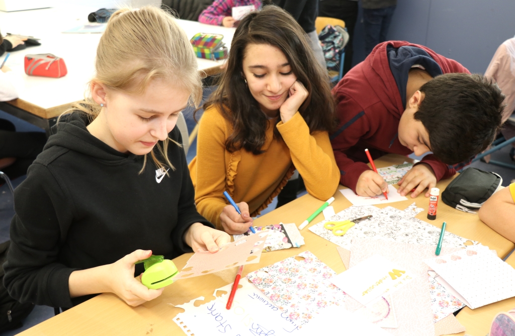 Mit guten Wünschen und Sprüchen sowie viel Bastelmaterial und Glitzer ging dann begeistert die Gestaltung los. Die Schülerinenn und Schüler gingen teilweise mit so großer Motivation ans kreative Werk, dass sie teilweise sogar die Pausen durcharbeiten wollten. Schon am ersten Tag wurden fast 80 Grußkarten fertig gestellt.