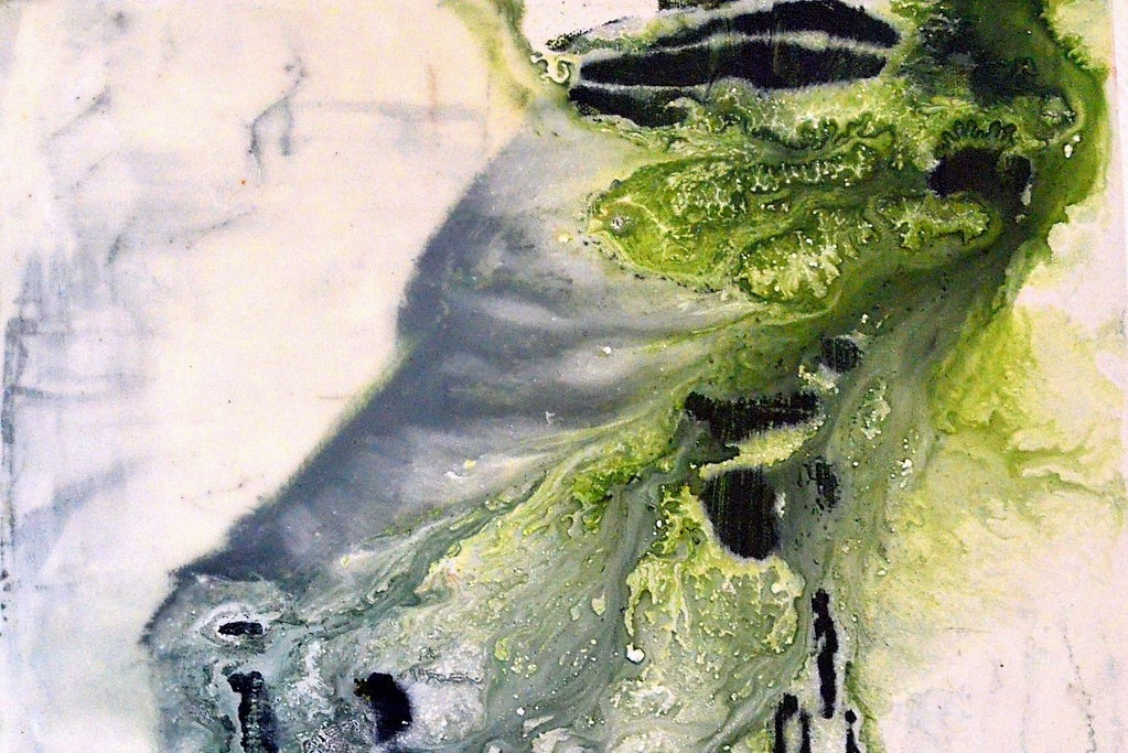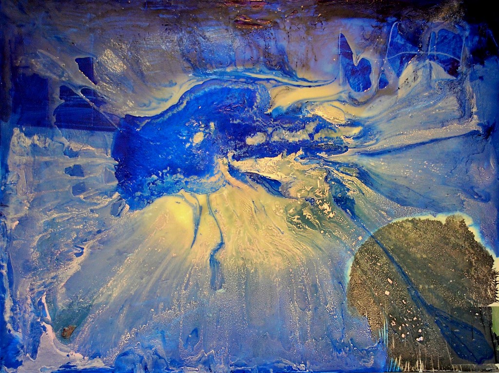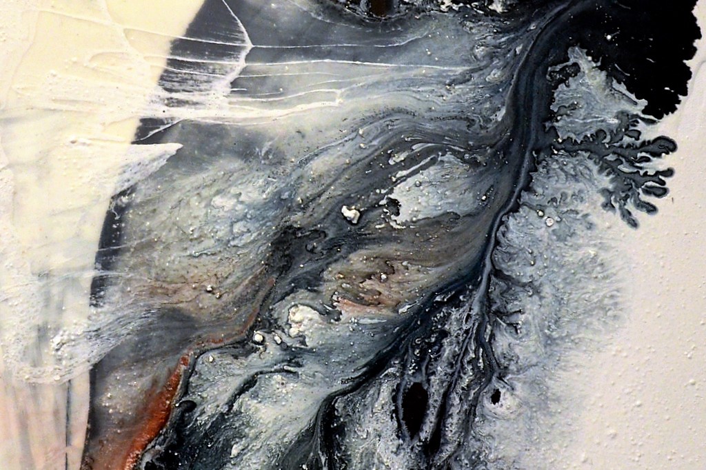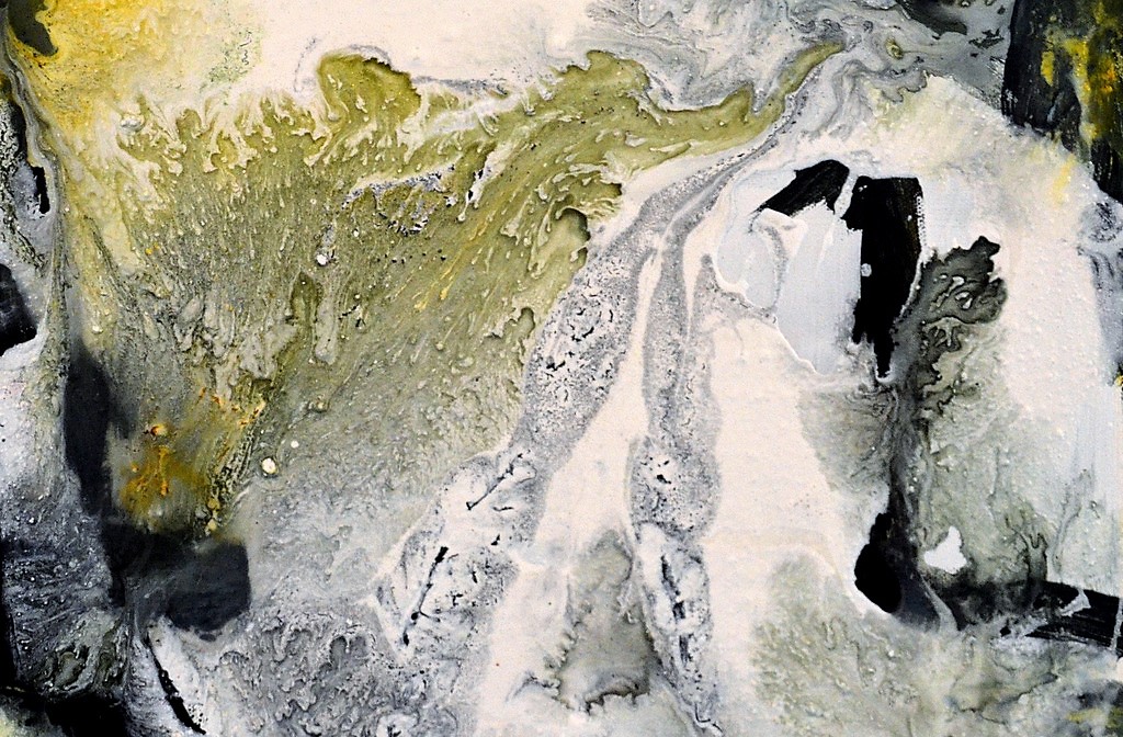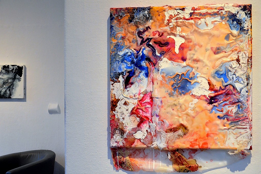 In ihren Arbeiten möchte die in Osnabrück lebende Künstlerin die Bewegung in der Stille darstellen – jenen Moment, in dem sich die Farben in der Mitte zentrieren, zum Stillstand kommen und doch die Bewegung noch erahnen lassen. „Ich zeige den Stillstand der Zeit, eine Erinnerung an den Moment, der dann einfriert.“ Dazu lässt sie Kunstharz durch Sand und Gaze tropfen, ein Prozess, der nur teilweise zu steuern ist. Das Harz nimmt eine Form an und bleibt dann stehen