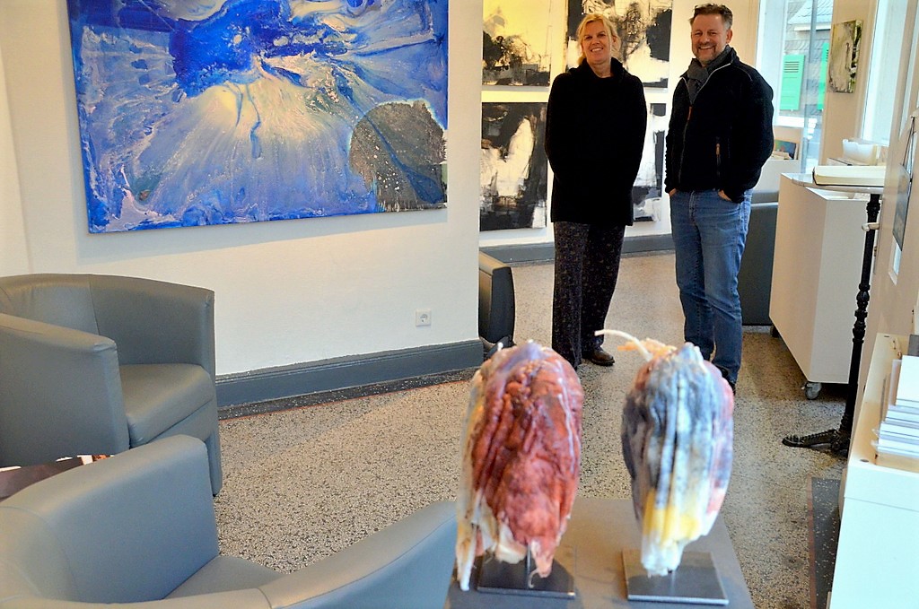 „Aus Platzgründen haben wir uns erst einmal auf die Bilder festgelegt“, erklärt Dirk Balke. Zwei kleine Skulpturen haben aber doch noch hineingefunden. Zwanzig Werke im Format 30 x 30 cm bis hin zu 120 x 160 cm sind in der Galerie ART-ECK zu besichtigen. „Es ist ungewöhnlich für die Galerie, abstrakte Arbeiten zu zeigen“, betont Balke, der sich selbst ausschließlich der gegenständlichen Malerei widmet. „Das heißt aber nicht, dass ich die abstrakte Malerei nicht schätze. An den Arbeiten von Petra Höcker fasziniert mich vor allem diese Energie, die die Werke ausströmen. In ihrer kraftvollen Präsenz haben sie trotzdem eine gewisse Sinnlichkeit, Poesie.“