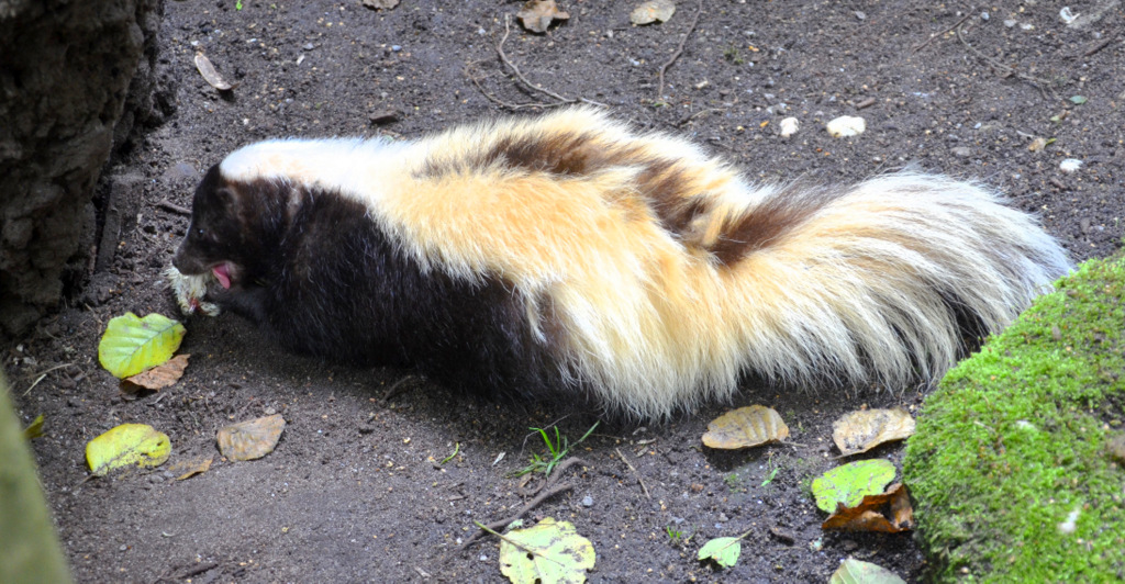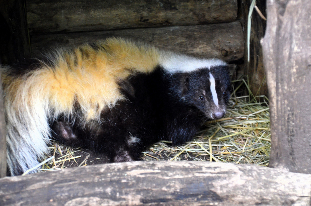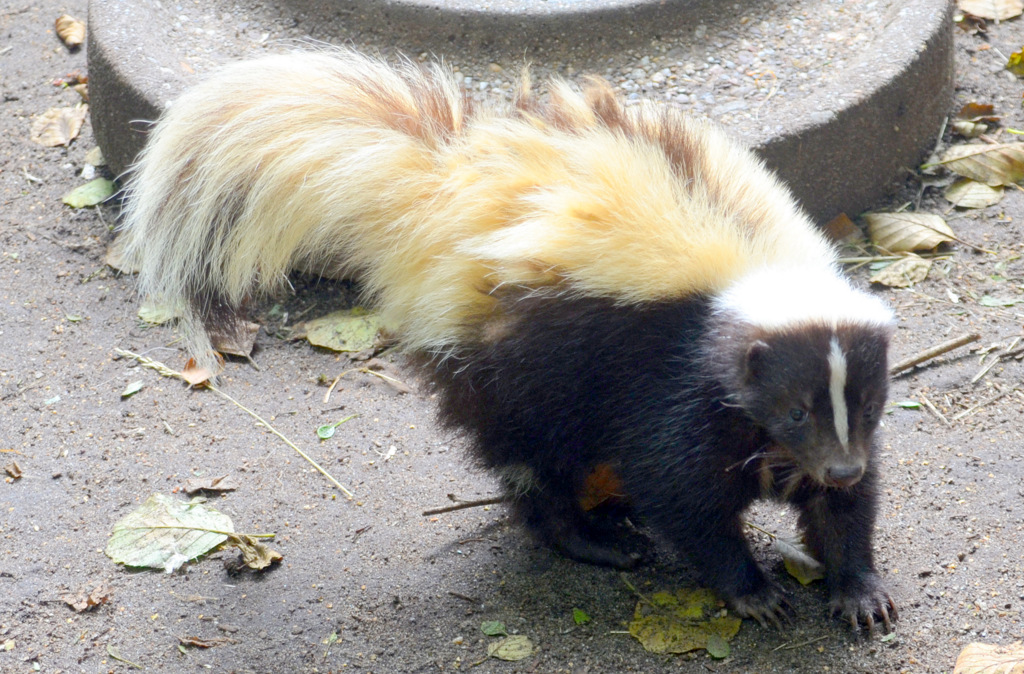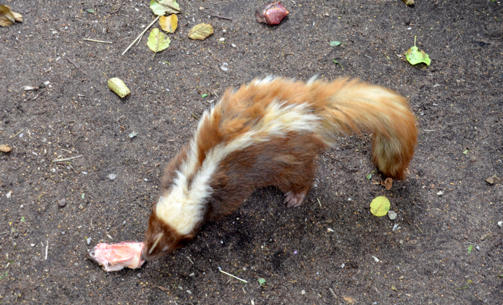 Fred und Bambam leben schon seit einigen Jahren miteinander. Vor ungefähr 1,5 Jahren verstärkte Mister Schiefer die Gruppe. Er kam aus einem holländischen Tierpark, der wegen schlechter Tierhaltung geschlossen wurde. In freier Natur findet man Stinktiere in den Steppen, im Buschland und den offenen Wäldern Amerikas. Sie sind eher dämmerungsaktiv. Tagsüber schlafen sie gerne. Ihre Nahrung ist hauptsächlich vegetarisch, doch als Raubtiere brauchen sie auch Fleisch. Obst sollte man ihnen nicht geben, da sie schnell zu Diabetes neigen. Gemüse eignet sich wesentlich besser.