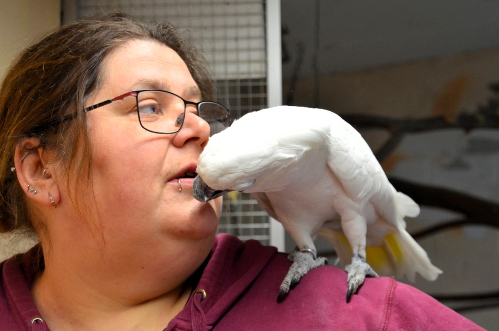 Carlo liebt Janett Heinrich, die ltd. Tierpflegerin, über alles. Sobald sie sich der Voliere nähert, will er sofort auf den Arm und gestreichelt werden. Er gibt Küsschen und klettert munter von einer Schulter auf die andere. Am liebsten kriecht er zum Kuscheln unter ihre Jacke.