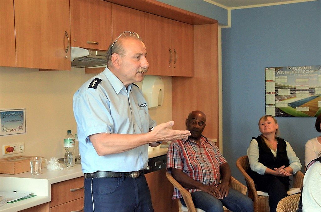 SOLINGEN (mh) – Lebhaft ging es heute im Treffpunkt „Dröppelmina“ zu. Polizeihauptkommissar Ulrich Schmidt war ins SenVital gekommen und klärte die Bewohnerinnen und Bewohner über Möglichkeiten zur Kriminalprävention auf. Ein Vortrag, der bei vielen der Anwesenden für Neugierde und Interesse sorgte.
