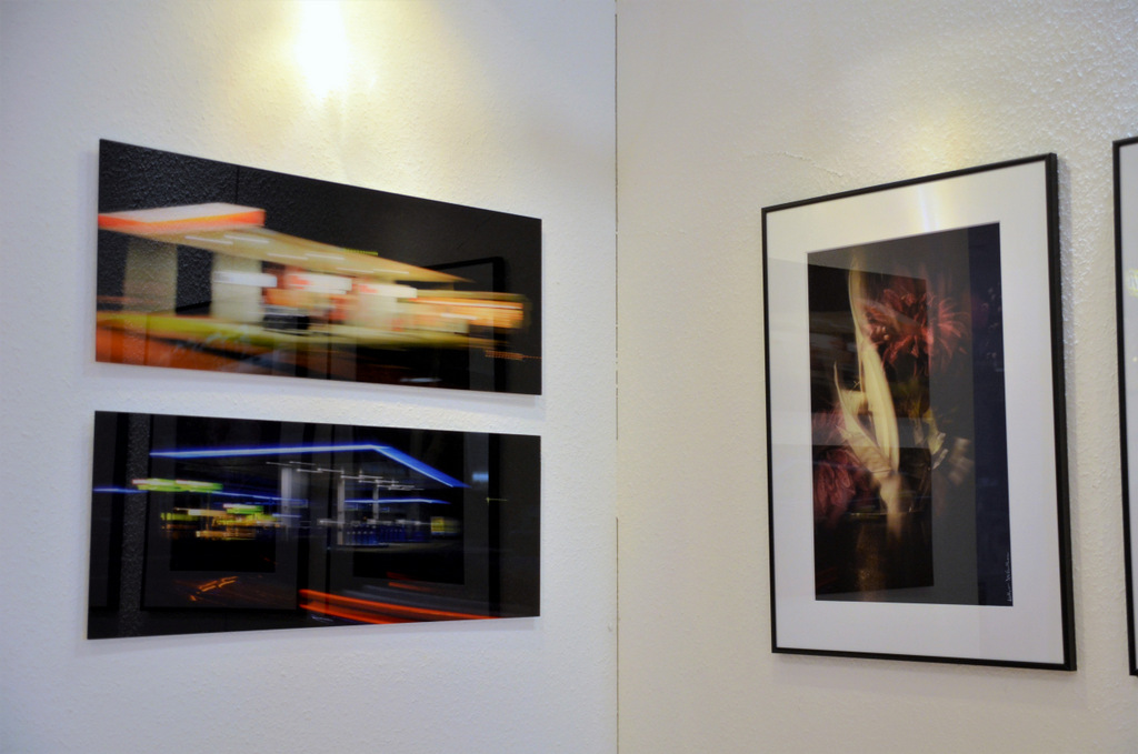 Auch zwei Tanzbilder hat der Fotograf mitgebracht. Sie gehören zu einem Fotozyklus von sechs Motiven in je vier verschiedenen Farbkompositionen. Tänzerinnen schweben in einem schwarzen Objektrahmen. Durch längere Belichtungszeiten ist eine starke Dynamik entstanden.
