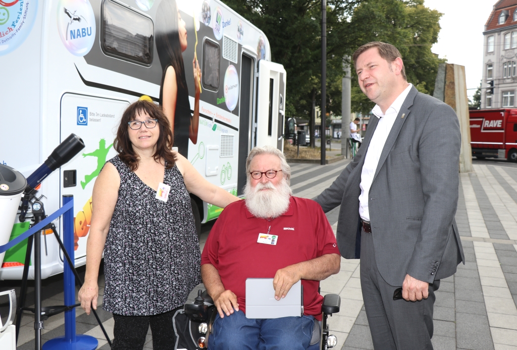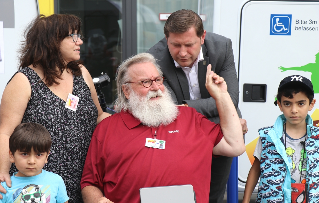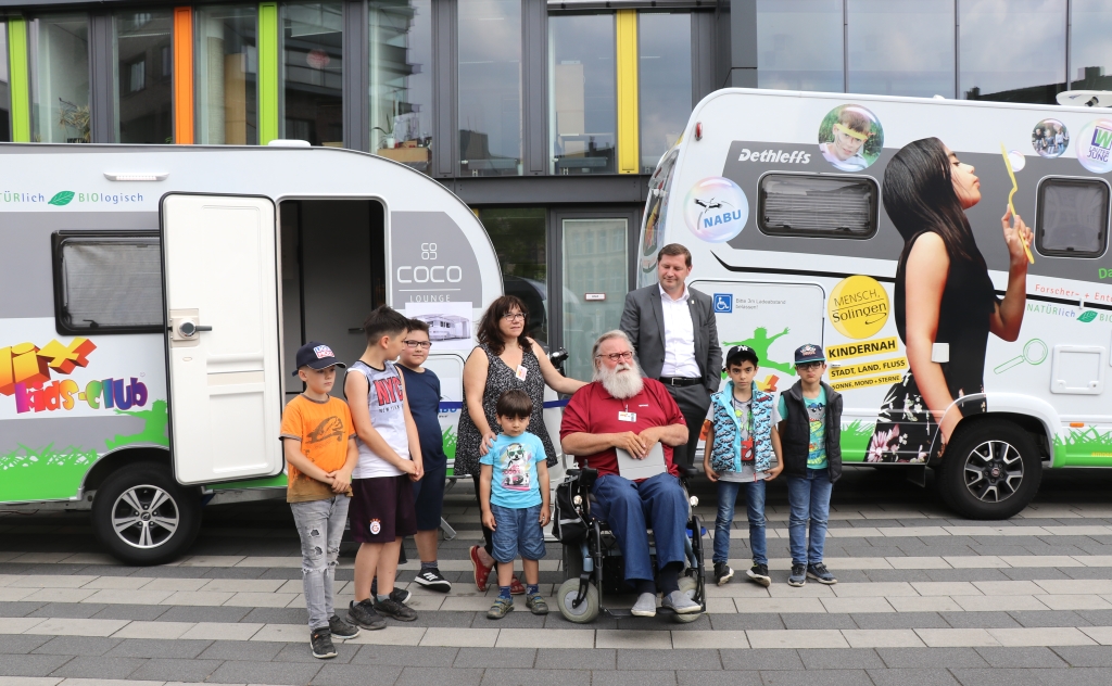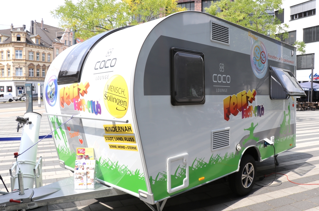 Am Donnerstag machte das Gespann vor dem Rathaus halt. Dort konnten Freunde und Förderer des Felix Kids-Clubs das neue Forscher- und Entdeckermobil genauestens unter die Lupe nehmen. Darunter auch Oberbürgermeister Tim Kurzbach: „Es ist toll, was der Felix Kids-Club leistet und wirklich unglaublich, dass immer wieder neue Projekte angegangen werden. Der Gedanke, Freizeit und Spaß mit Bildung zu verbinden, ist wirklich großartig“, lobte der OB. Auf dem Wohnwagen und dem Anänger prangen inzwischen auch zwei große „Mensch Solingen“-Aufkleber, so dass der Kids-Club unterwegs sogar noch Werbung für die Klingenstadt macht.