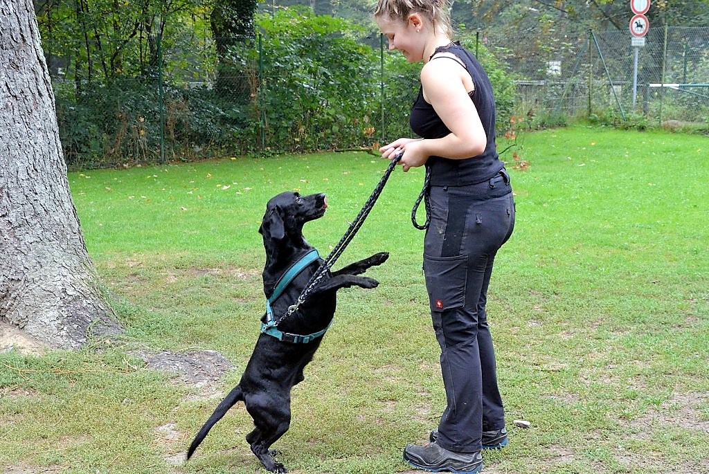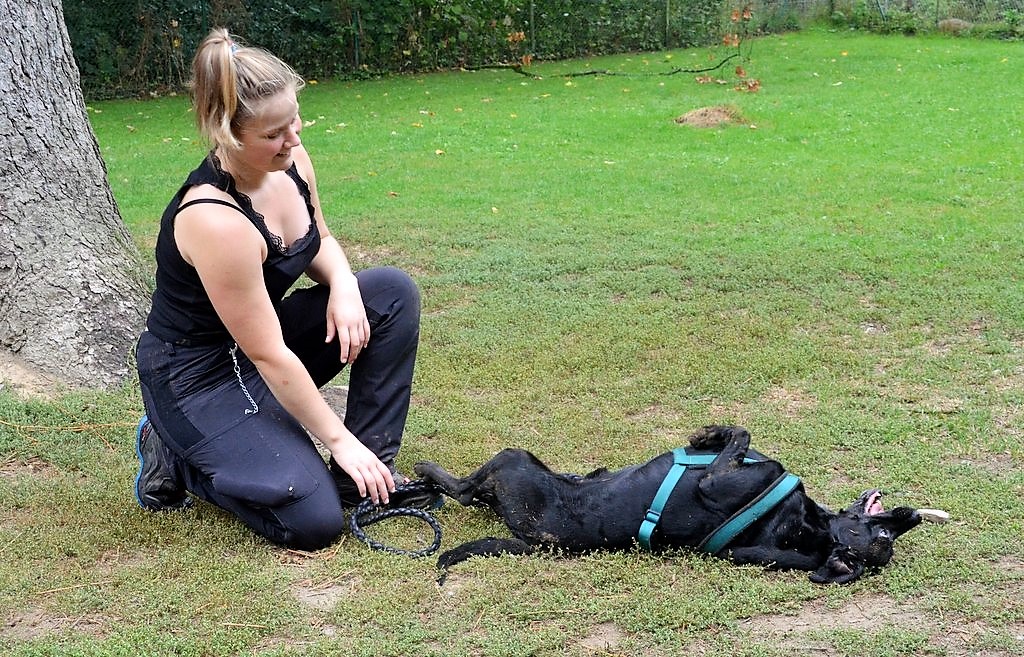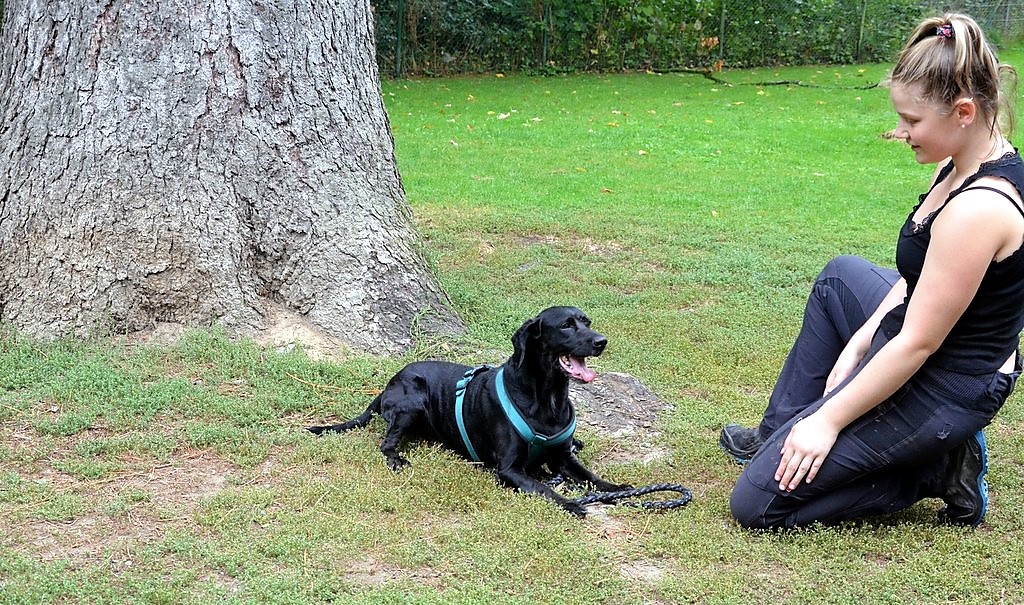 Die angehende Tierpflegerin, die im kommenden Frühjahr ihre Ausbildung abschließen wird, kümmert sich viel um den Rüden. Mit ihr tobt der schwarzhaarige Labrador-Cocker-Mix bereitwillig draußen herum. „Kurze Kommandos, wie „Sitz“ oder „Platz“ versteht er“, hat Kruska festgestellt. Gerne robbt oder kriecht er auf dem Bauch über den Boden. Ob er dabei einer imaginären Beute folgt oder einfach Spaß daran hat, verrät er nicht. Das Fell ist danach nicht mehr ganz so schwarz. Ansonsten ist sein Kurzhaar sehr pflegeleicht.