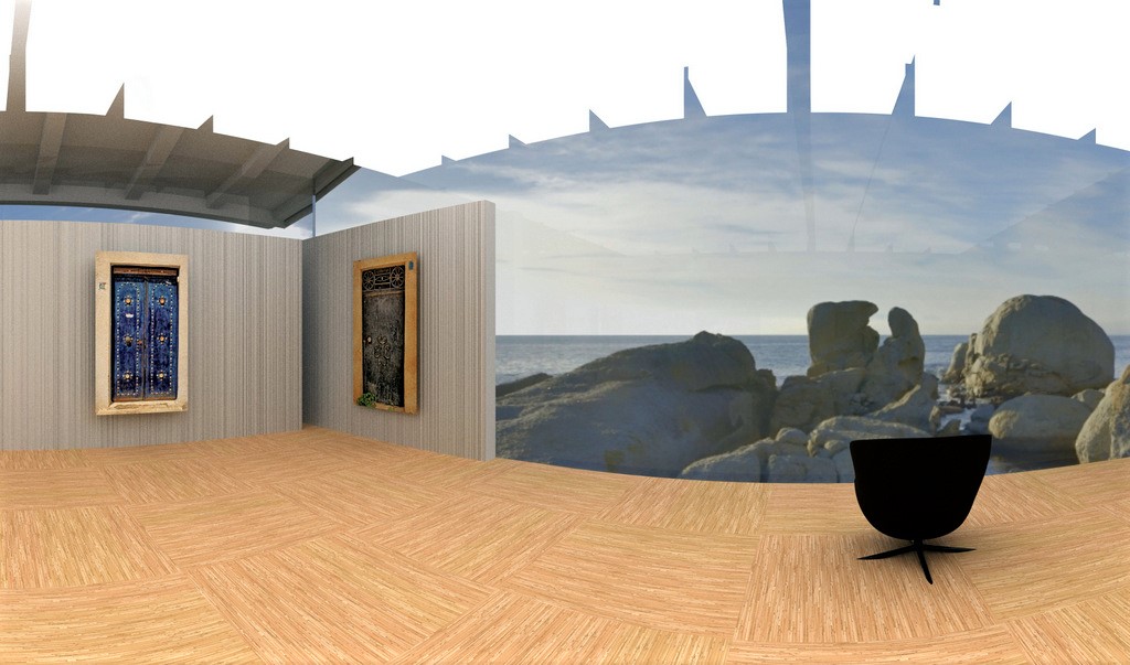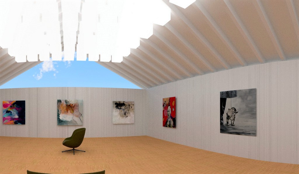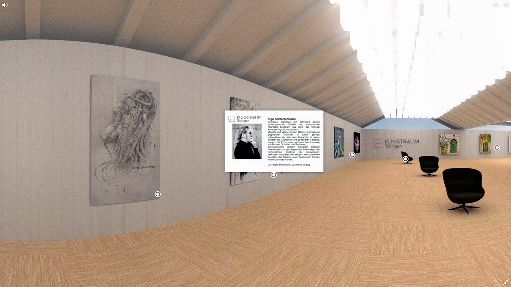 Der Entschluss war schnell gefasst. Voß setzte sich an seinen Rechner und entwarf einen virtuellen Ausstellungsraum. Genau betrachtet sind es sogar drei Räume, auf virtuelle Weise einer Galerie angepasst. In einer 360° Grad Perspektive kann der Betrachter jetzt eine Vielzahl von Darstellungen besichtigen. Mit einem Klick auf den am unteren Bildrand befindlichen Punkt erscheint neben dem Namen des Künstlers ebenfalls ein Auszug aus seiner Vita. Ein Klick auf die Türen führt den Besucher in einen der anderen Räume, in denen weitere Künstler ihre großartigen Werke präsentieren.