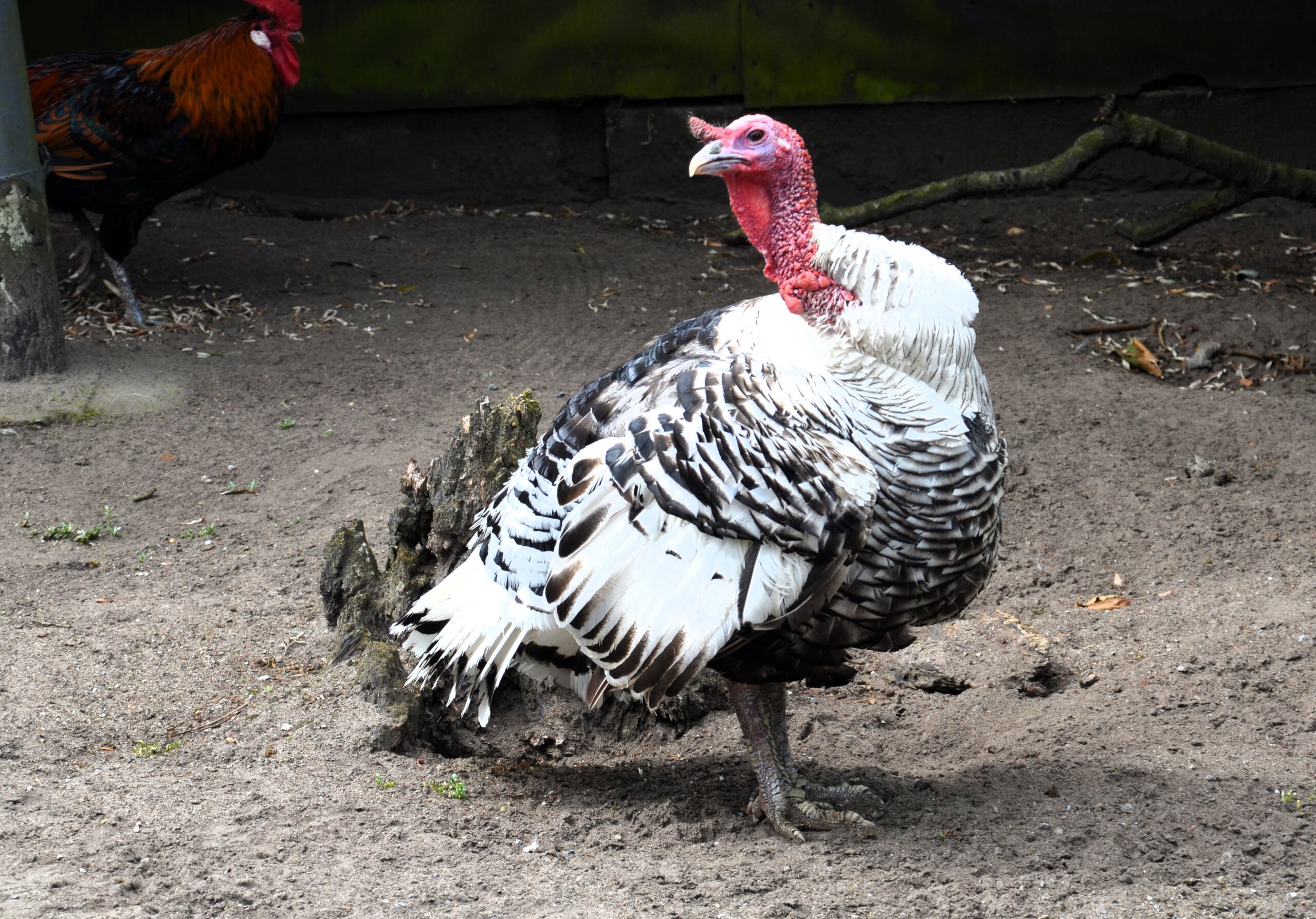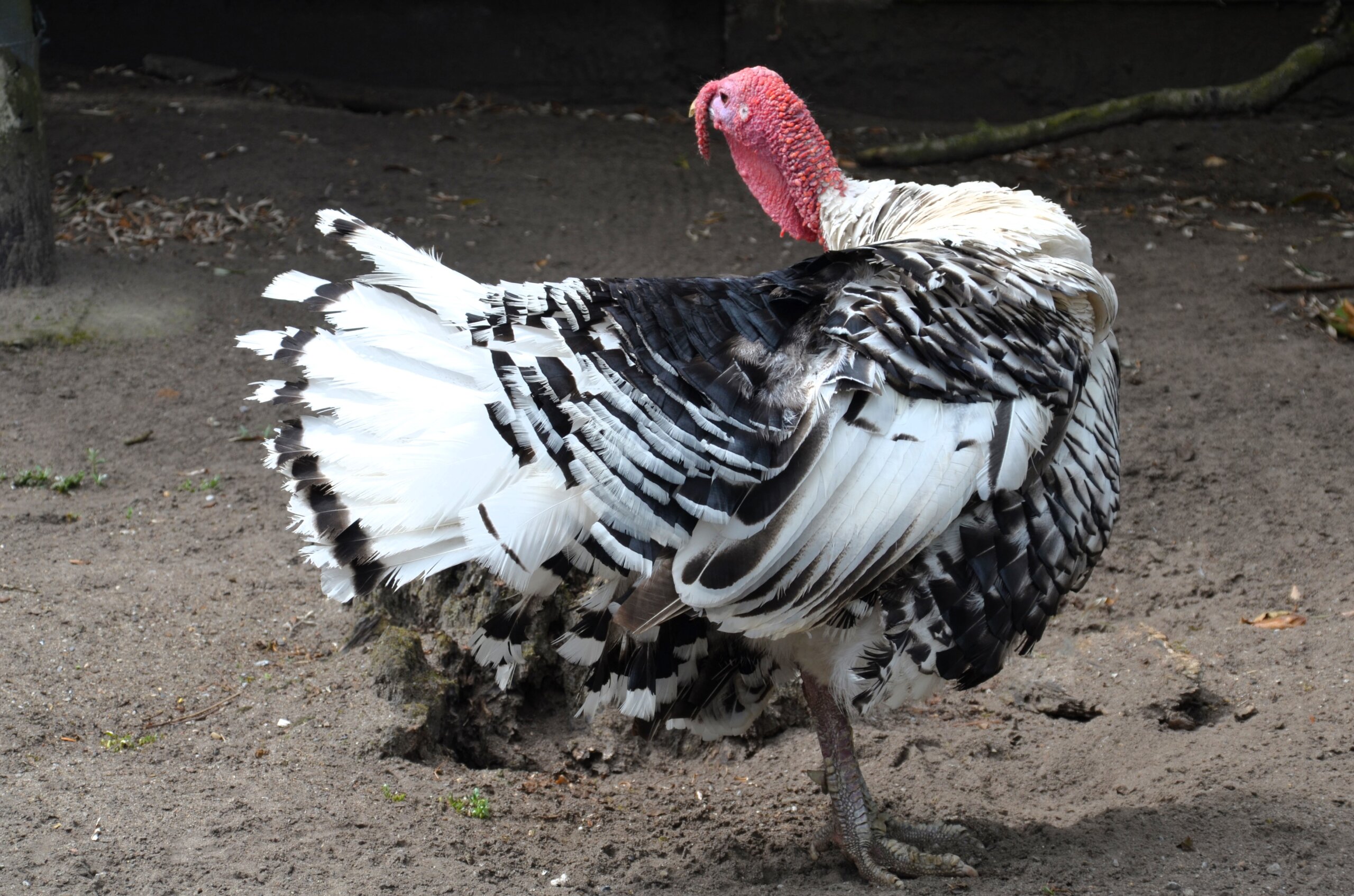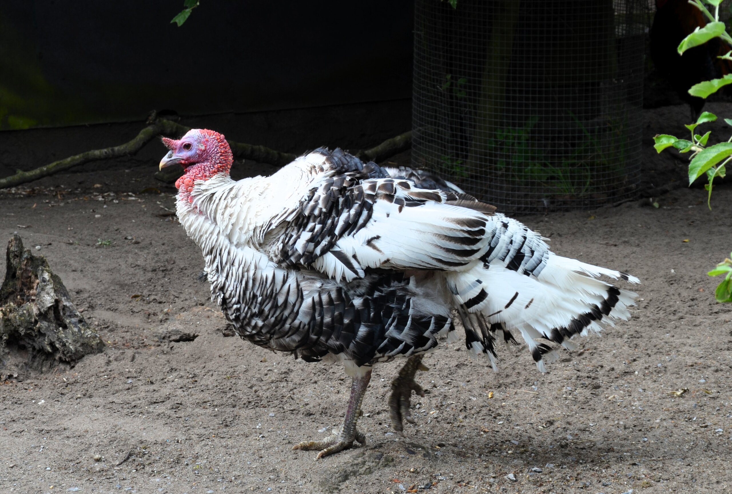 Schon beim ersten Blick fällt das prachtvolle Äußere dieser besonderen Truthühner auf: Ihr schneeweißes Gefieder ist von tiefschwarzen Säumen gesäumt – jede einzelne Feder wirkt wie von Hand bemalt. Die Armschwingen leuchten am Ende in sattem Schwarz, die kräftigen Läufe zeigen sich in dezenten Fleisch- bis Rottönen. In der Balzzeit wird das elegante Erscheinungsbild noch von einem eindrucksvollen Ritual gekrönt. Der Hahn schlägt mit den Schwanzfedern ein imposantes Rad, spreizt die Flügel, stellt seinen roten Kamm auf und ruft lautstark, um die Aufmerksamkeit der Henne zu gewinnen.