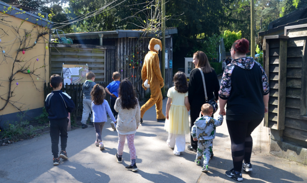 Pünktlich zur vollen Stunde drehte der Osterhase seine Runden durch den Park. Umringt von fröhlichen Kindern führte er sie auf abenteuerliche Nestersuche zwischen Gehegen, Büschen und Bäumen. Jede versteckte Ostertüte war individuell mit dem Namen des Kindes versehen – so fand wirklich jeder kleine Besucher sein persönliches Osterüberraschungspaket.