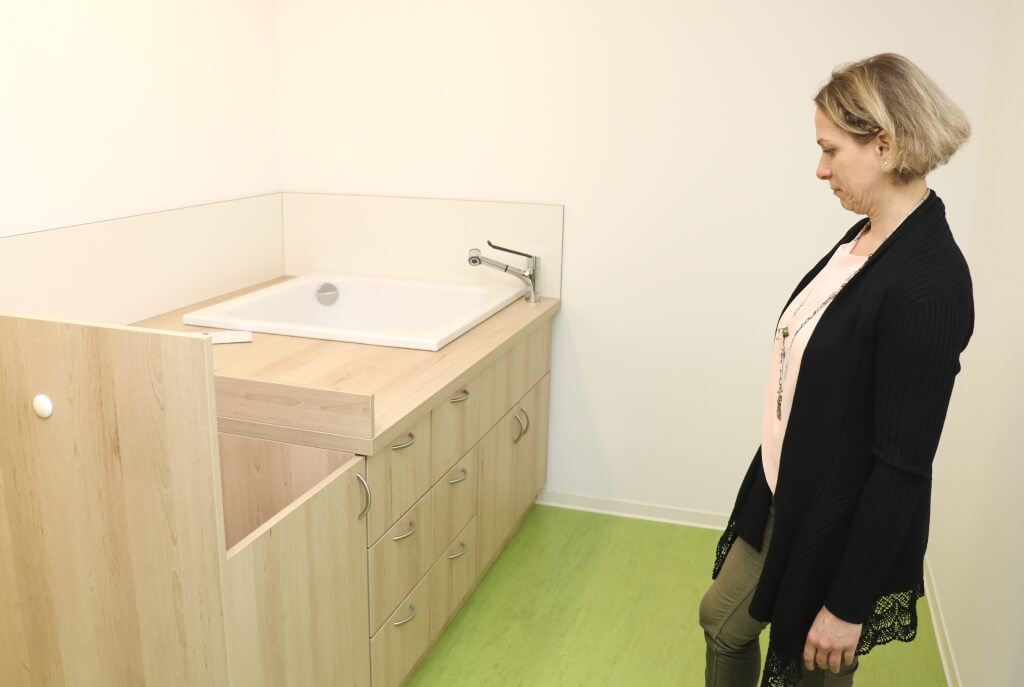 „Wir werden hier kein Mittagessen kochen, aber saisonal mal Apfelkompott, Marmelade oder auch mal Nudeln. Die Küchen verfügen über Auszüge, so dass die Kinder richtig daran teilhaben können“, sagte Claudia Hagemann. Für das reguläre Mittagessen sorgen die Mitarbeiterinnen und Mitarbeiter der Kita ohnehin. Eine Maxime der inklusiven Kita ist es, den Kindern so viel Selbstständigkeit beizubringen wie möglich. Neben den Gruppenräumen befinden sich Ruhe- und Differenzierungsräume. Die sanitären Anlagen sind komplett auf die Bedürfnisse der Kinder zugeschnitten. „Der Sanitärbereich ist voll ausgestattet mit Wickeltisch und WC-Trennwänden, die Spülbecken auf Kinderhöhe installiert“, erklärte Volksbank-Architekt Andreas Bona.